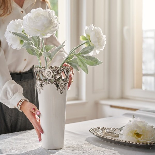 Wazon działa jak wizualny punkt odniesienia — skupia uwagę i sprawia, że pozostałe elementy zestawu układają się w spójną całość, zamiast konkurować ze sobą. - Pozwala innym dekoracjom „oddychać”