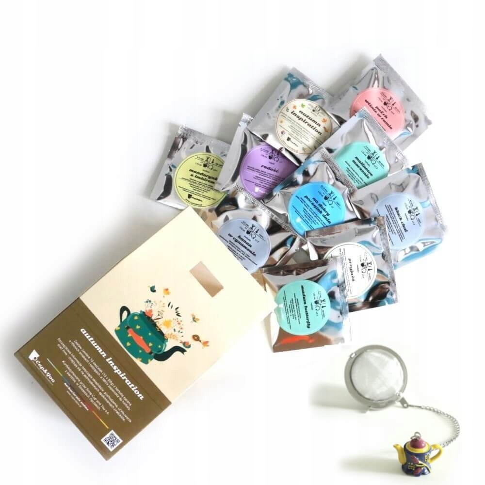 - Autumn inspiration Zestaw herbat z zaparzaczem: 10 saszetek – 10szt x 5g z różnymi rodzajami i smakami herbat oraz zaparzacz z zawieszką