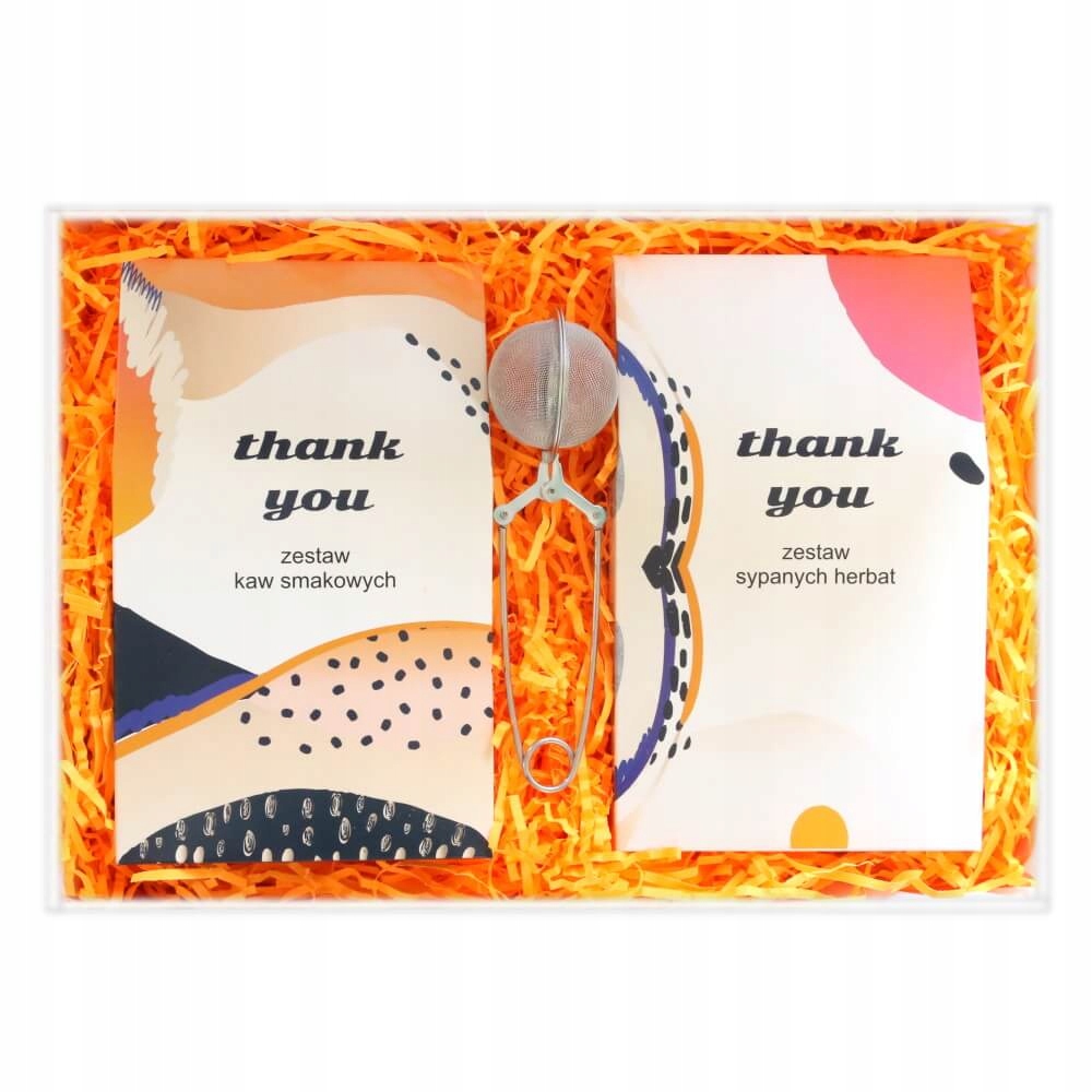 BOX PREZENTOWY NA PODZIĘKOWANIE "THANK YOU" - ZESTAW KAW SMAKOWYCH I HERBAT SYPANYCH + ZAPARZACZ - NA PREZENT UPOMINEK DLA KOBIETY FACETA NIEJ NIEGO
