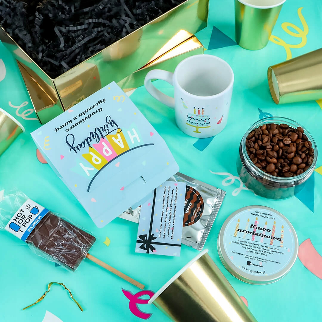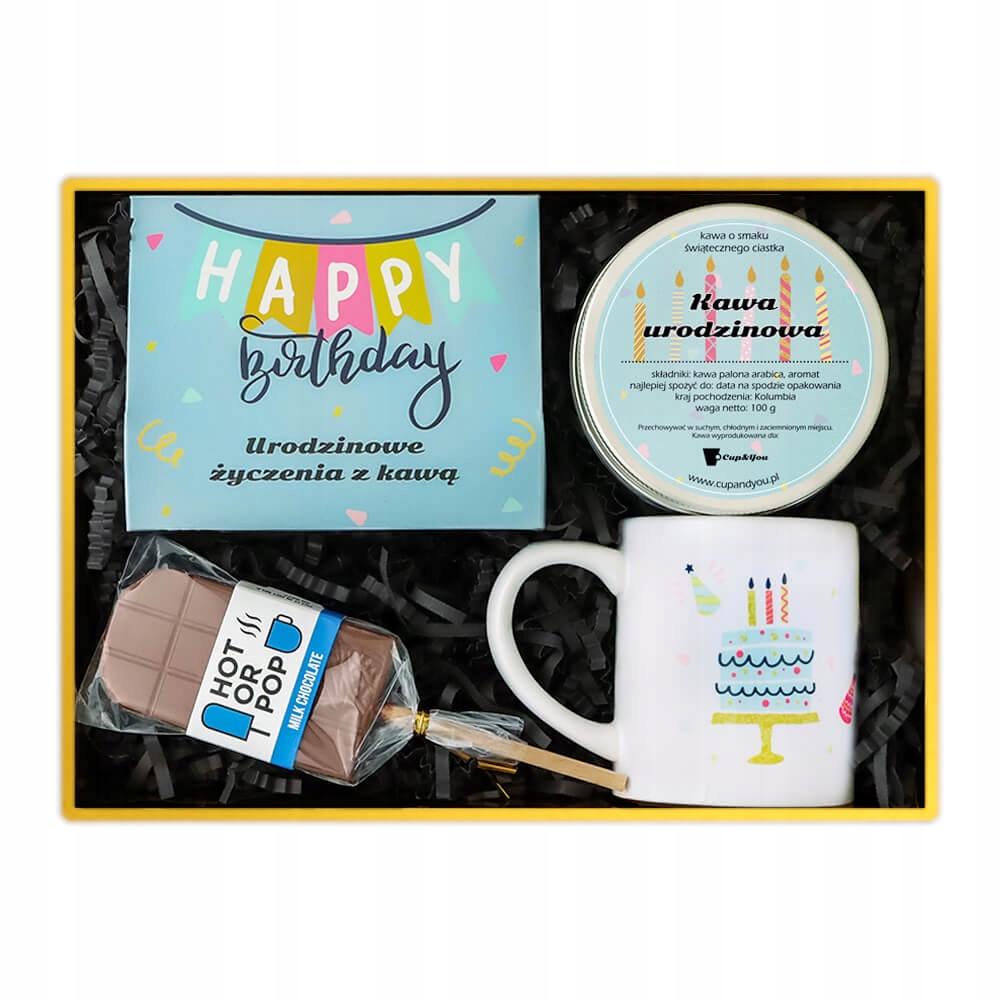 BOX PREZENTOWY URODZINOWY - ZESTAW KAW AROMATYZOWANYCH KUBEK CZEKOLADOWY LIZAK - PREZENT NA 20 30 40 50 60 URODZINY DLA KOBIETY FACETA MĘŻCZYZNY NIEJ NIEGO