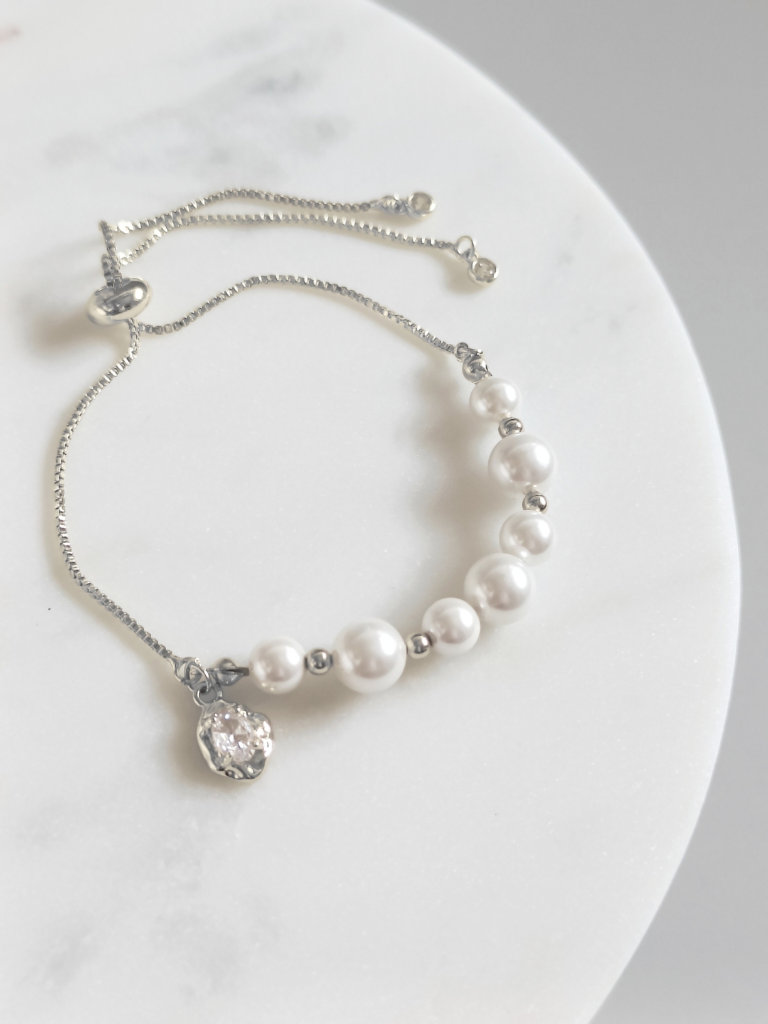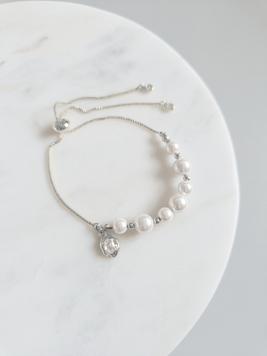 Bransoletka wykonana ręcznie z mosiądzu platerowanego rodem, stali nierdzewnej i pereł muszlowych seashell.
