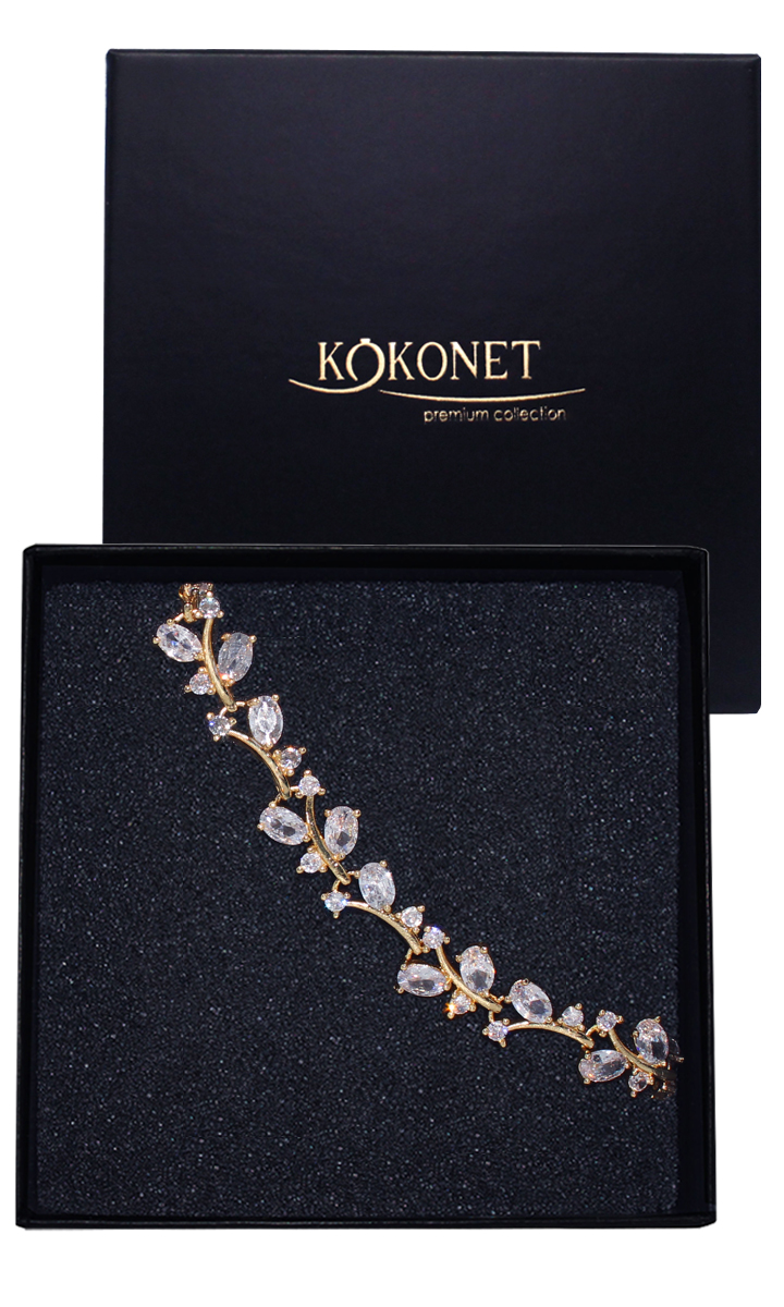 Bransoletka złota ślubna motyw roślinny BOHO cyrkonie błysk pudełko GRATIS