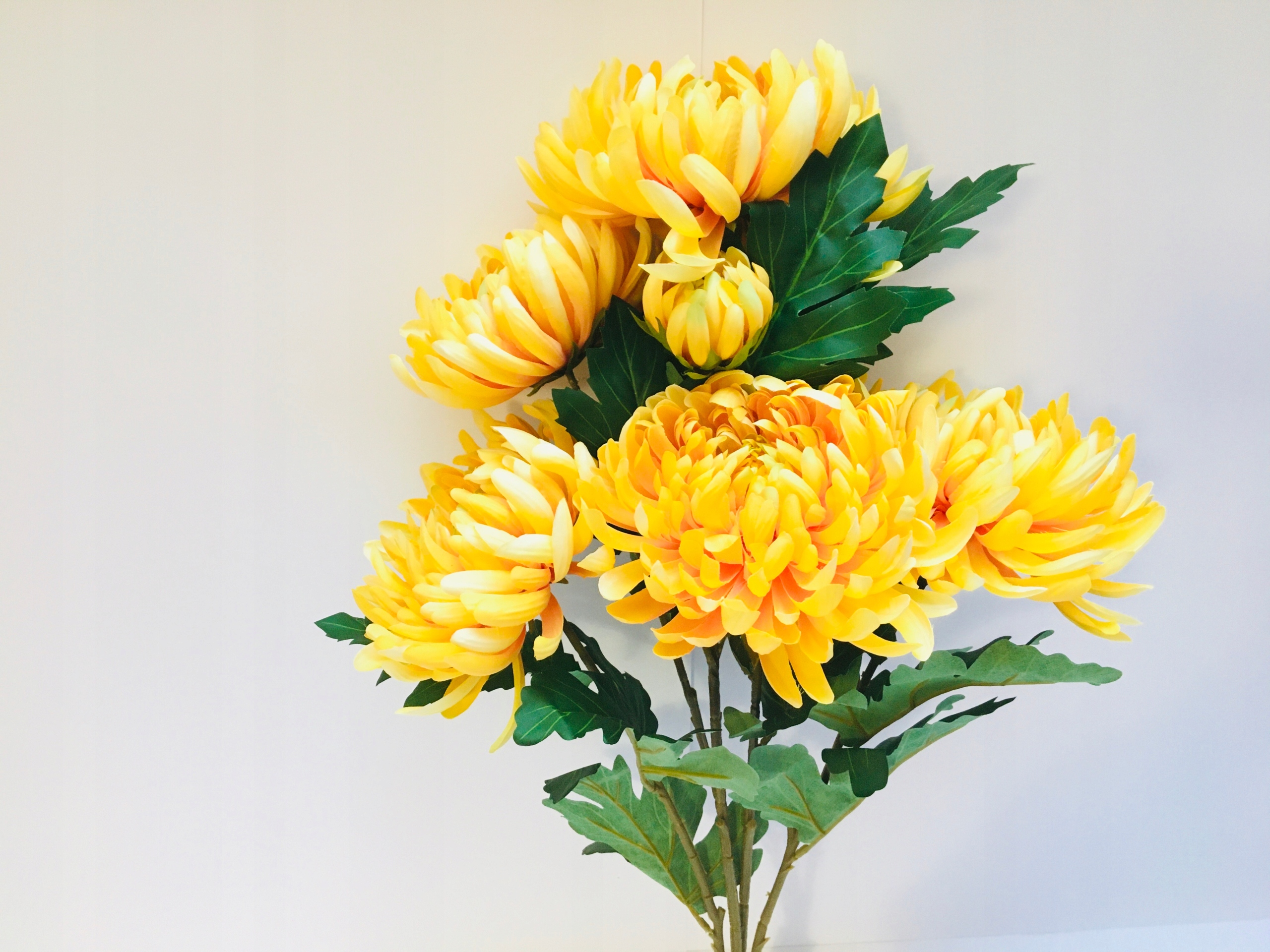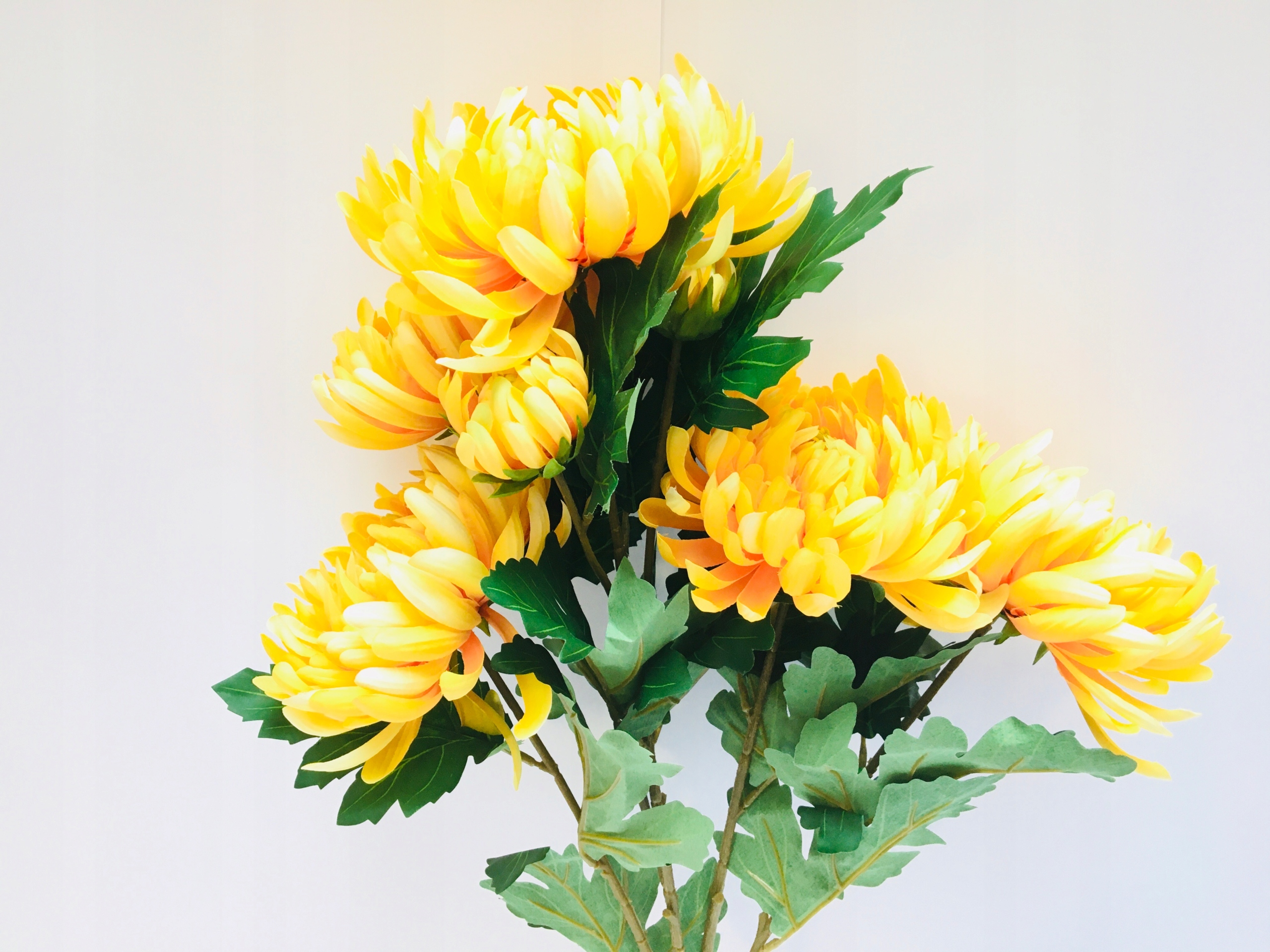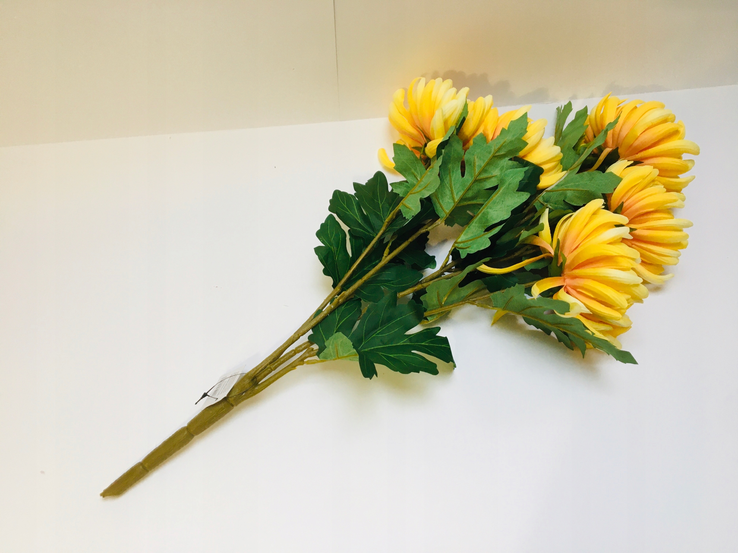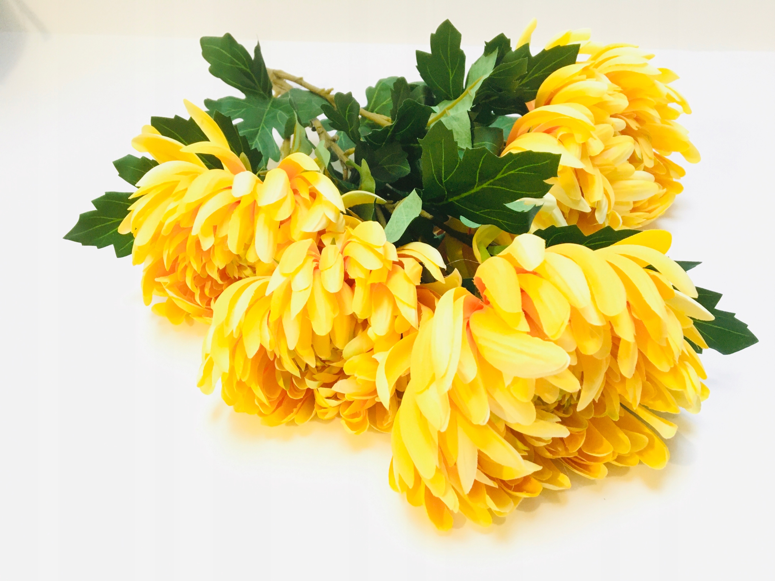 BUKIET DUŻY chryzantemy ŻÓŁTE sztuczne LIŚCIE do flakonu na cmentarz grób