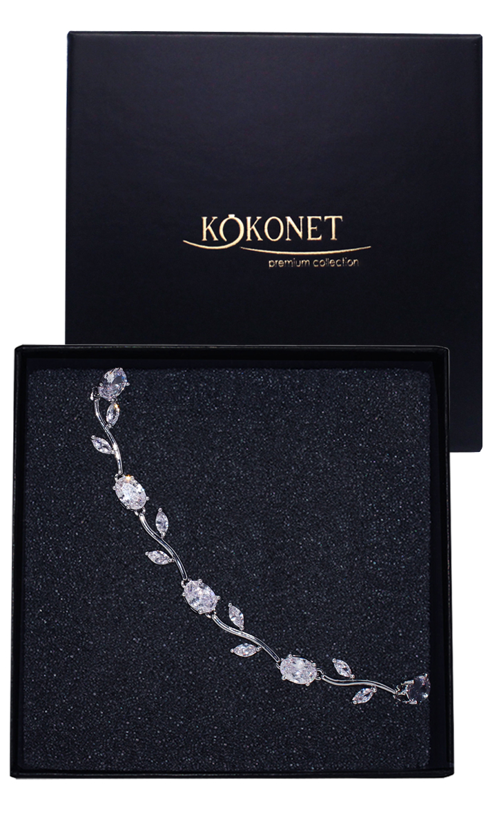 Delikatna srebrna bransoletka ślubna z cyrkoniami listkami BOHO rustykalna