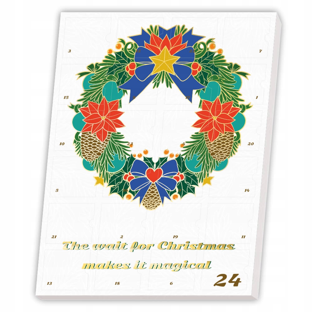 Wizualna szata kalendarza nawiązuje do wieńca adwentowego, który również przywodzi przedświąteczny czas oczekiwania Świąt.