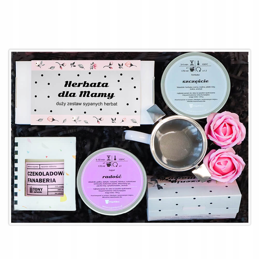 DUŻY ZESTAW PREZENTOWY NA DZIEŃ MATKI URODZINY - ŚWIECA SOJOWA KUBEK HERBATA SYPANA KAWA SMAKOWA ZAPARZACZ - PREZENT UPOMINEK DLA MAMY TEŚCIOWEJ