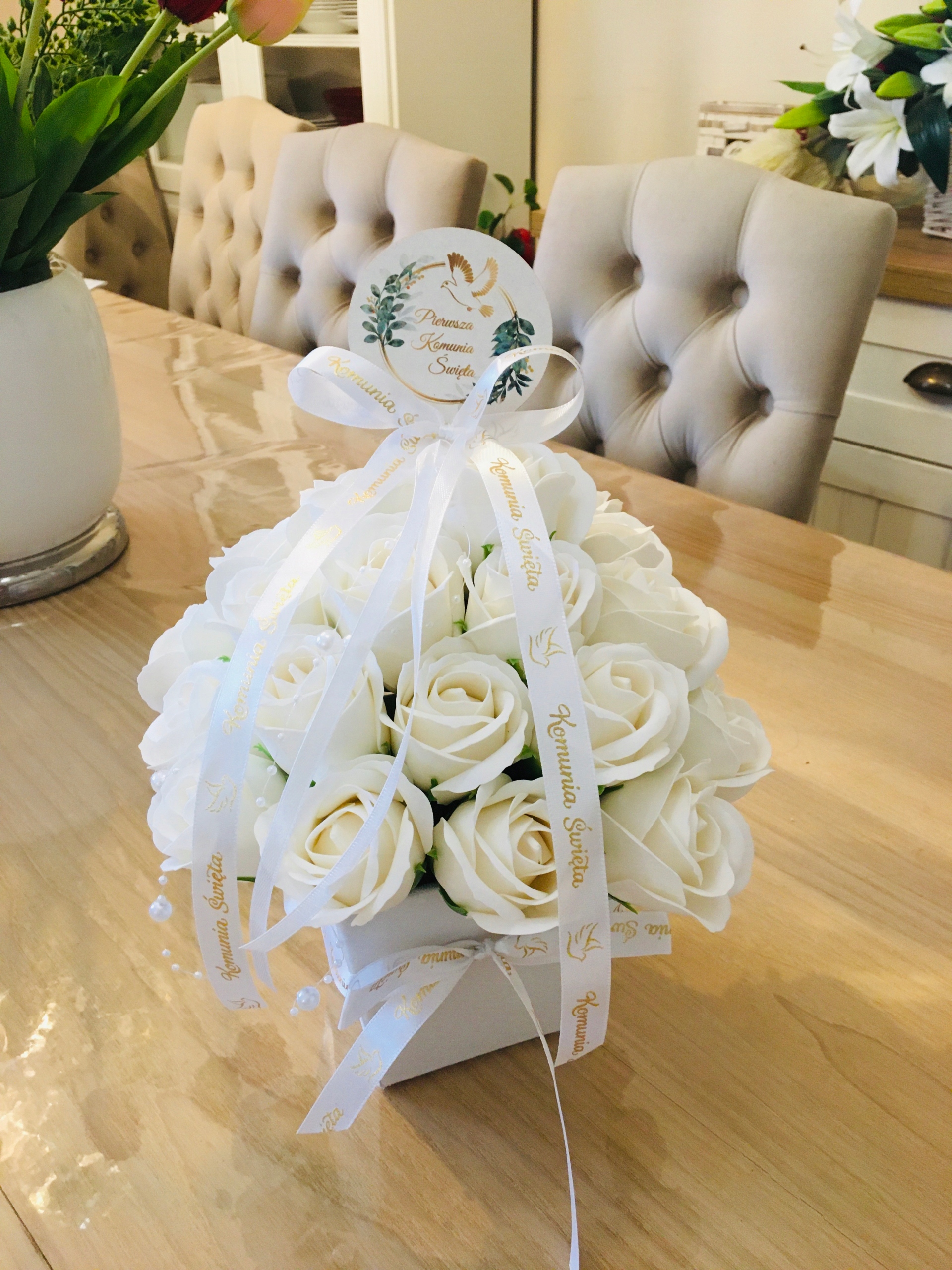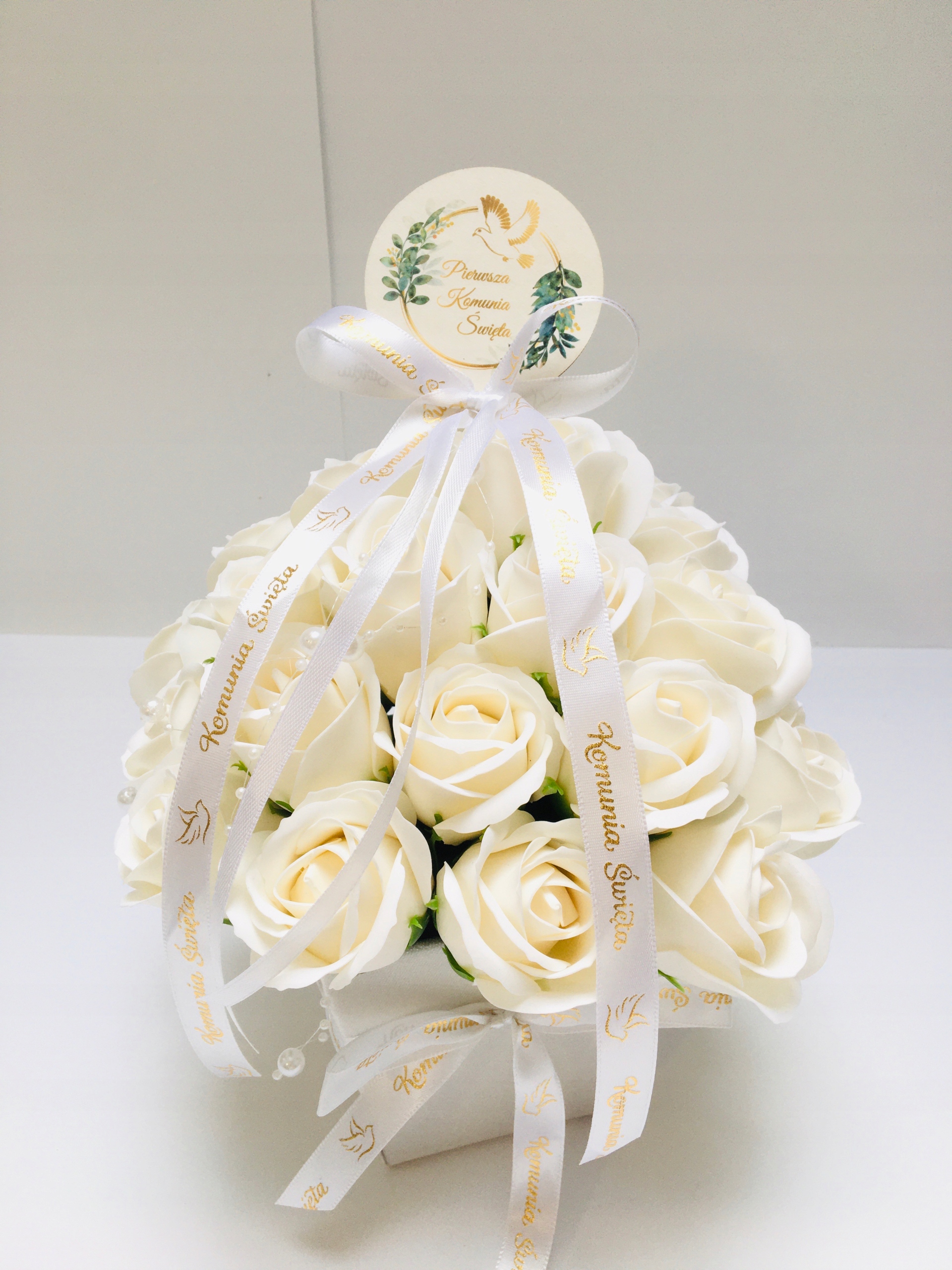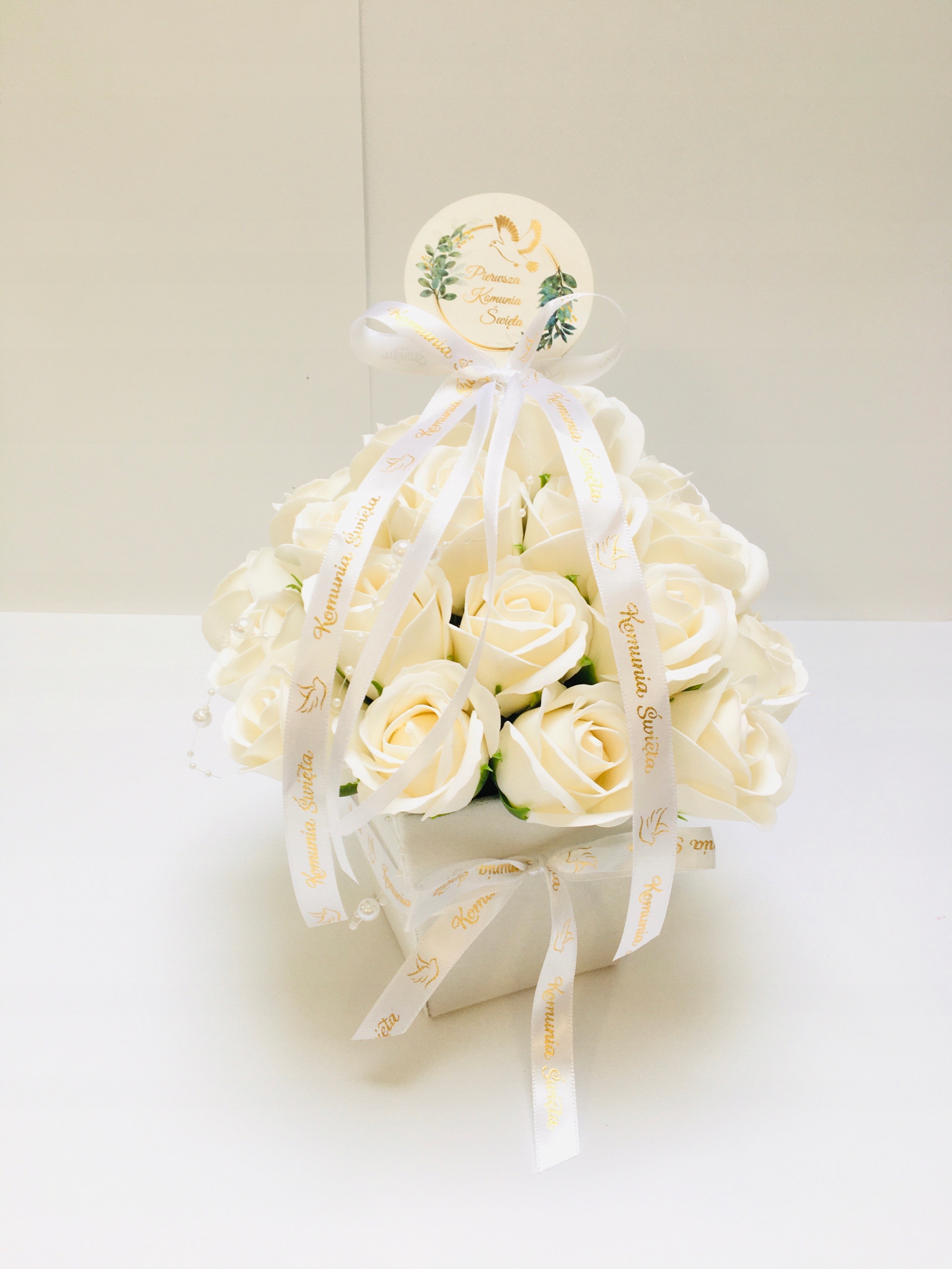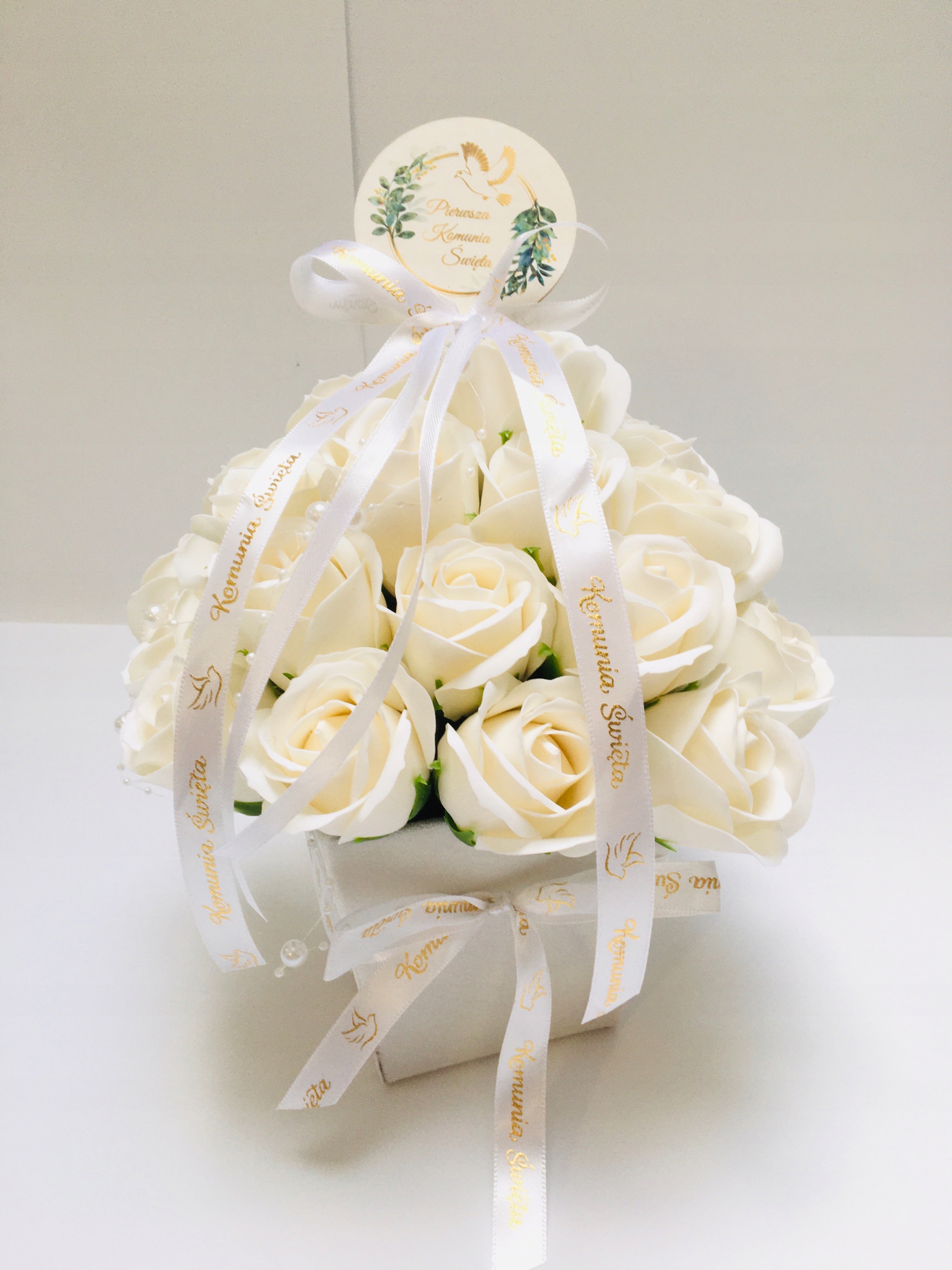 FLOWER BOX KWIATY mydlane BIAŁE na I KOMUNIA ŚWIĘTA prezent pamiątka róże