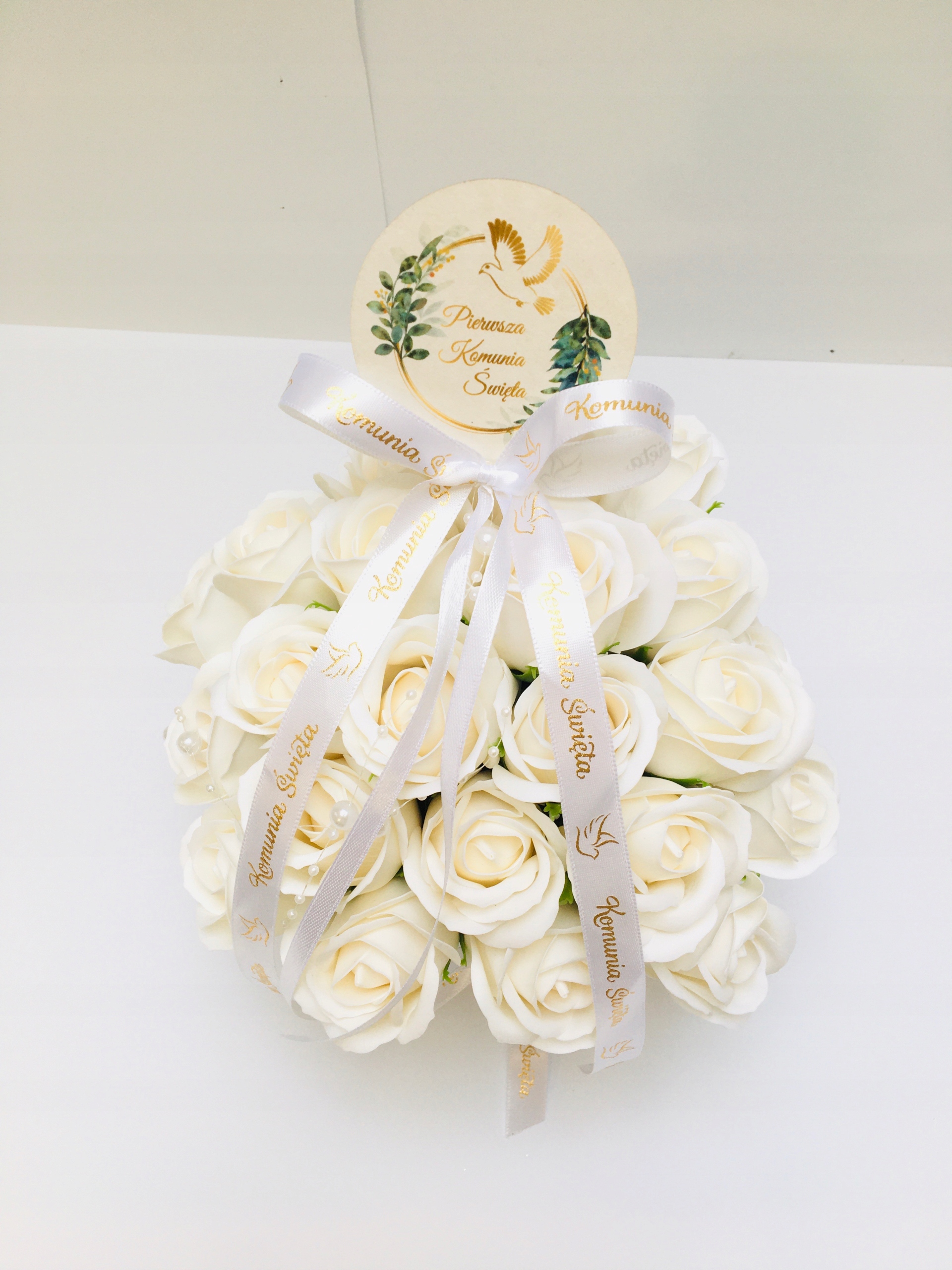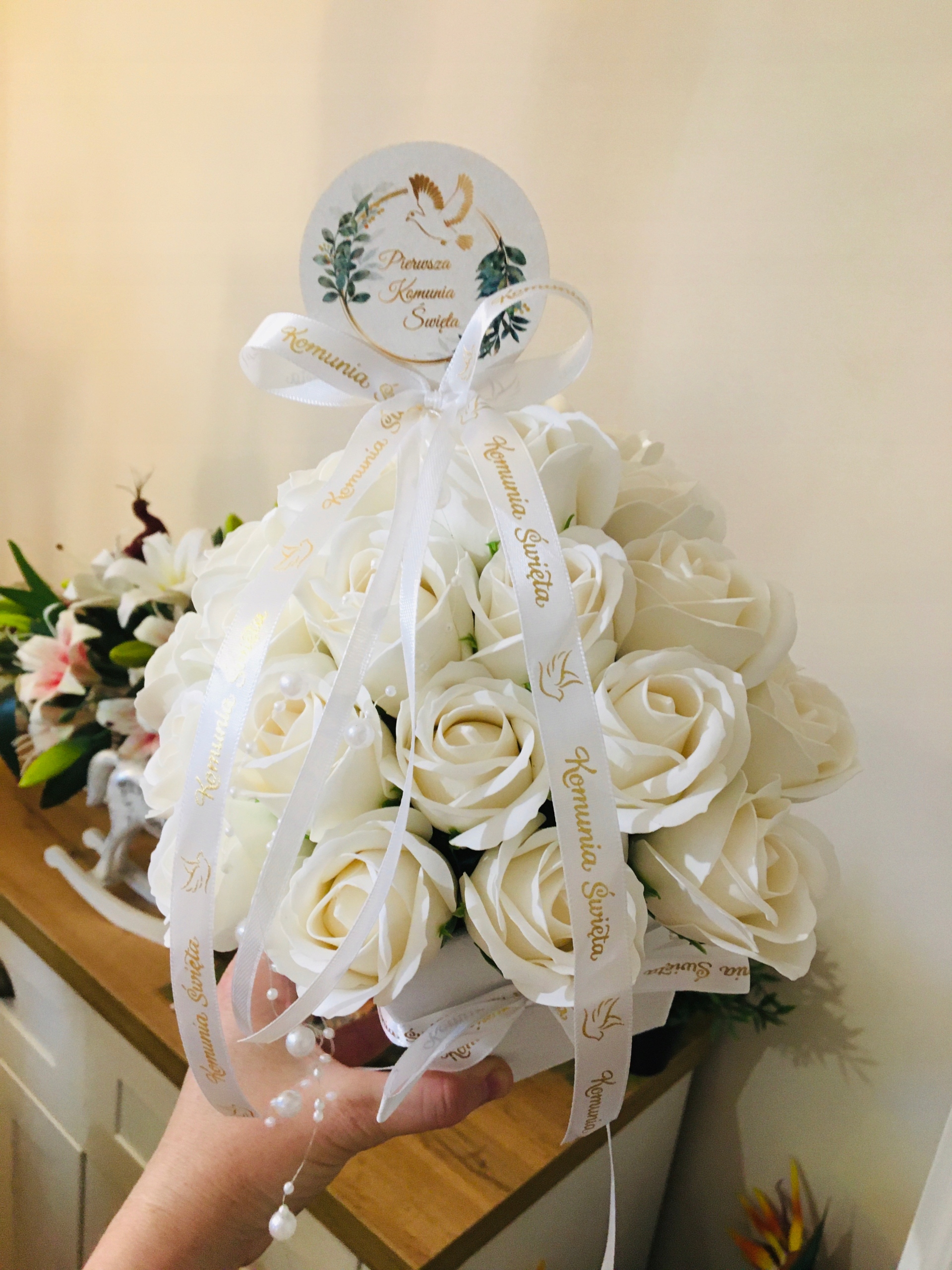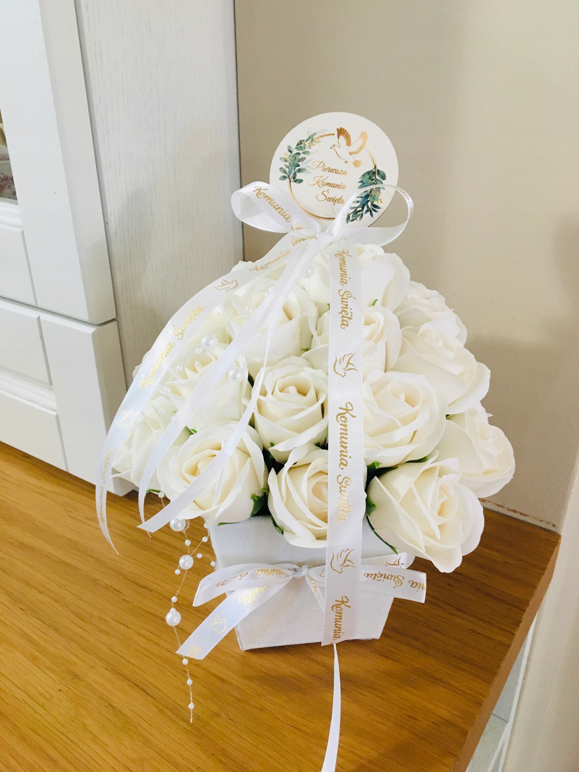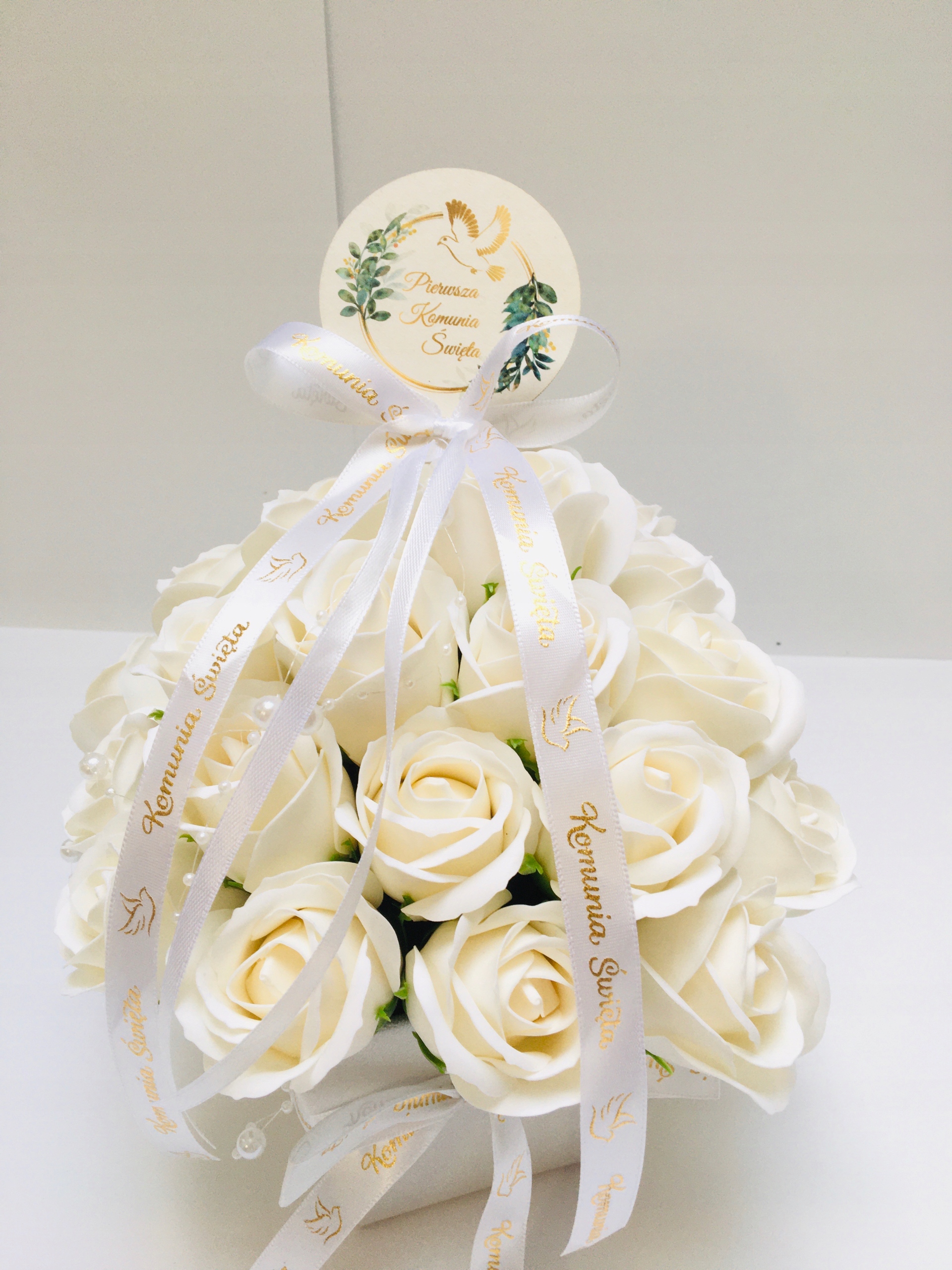 FLOWER BOX KWIATY mydlane BIAŁE na I KOMUNIA ŚWIĘTA prezent pamiątka róże