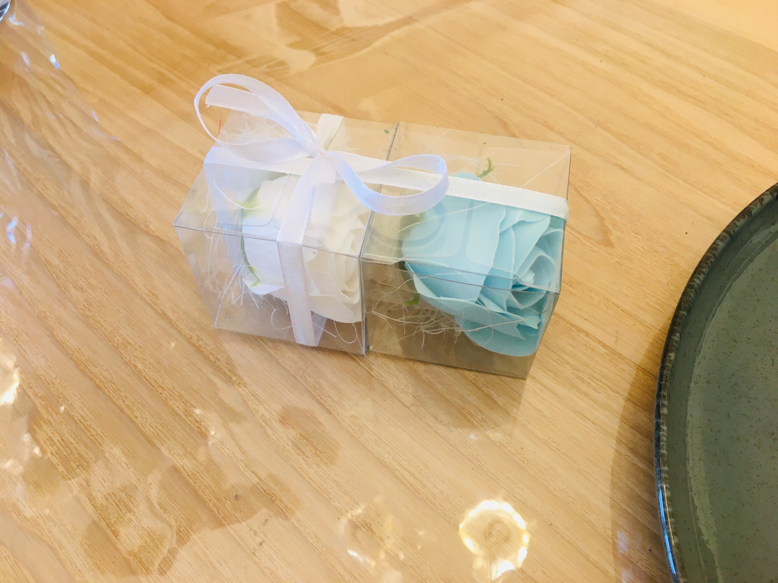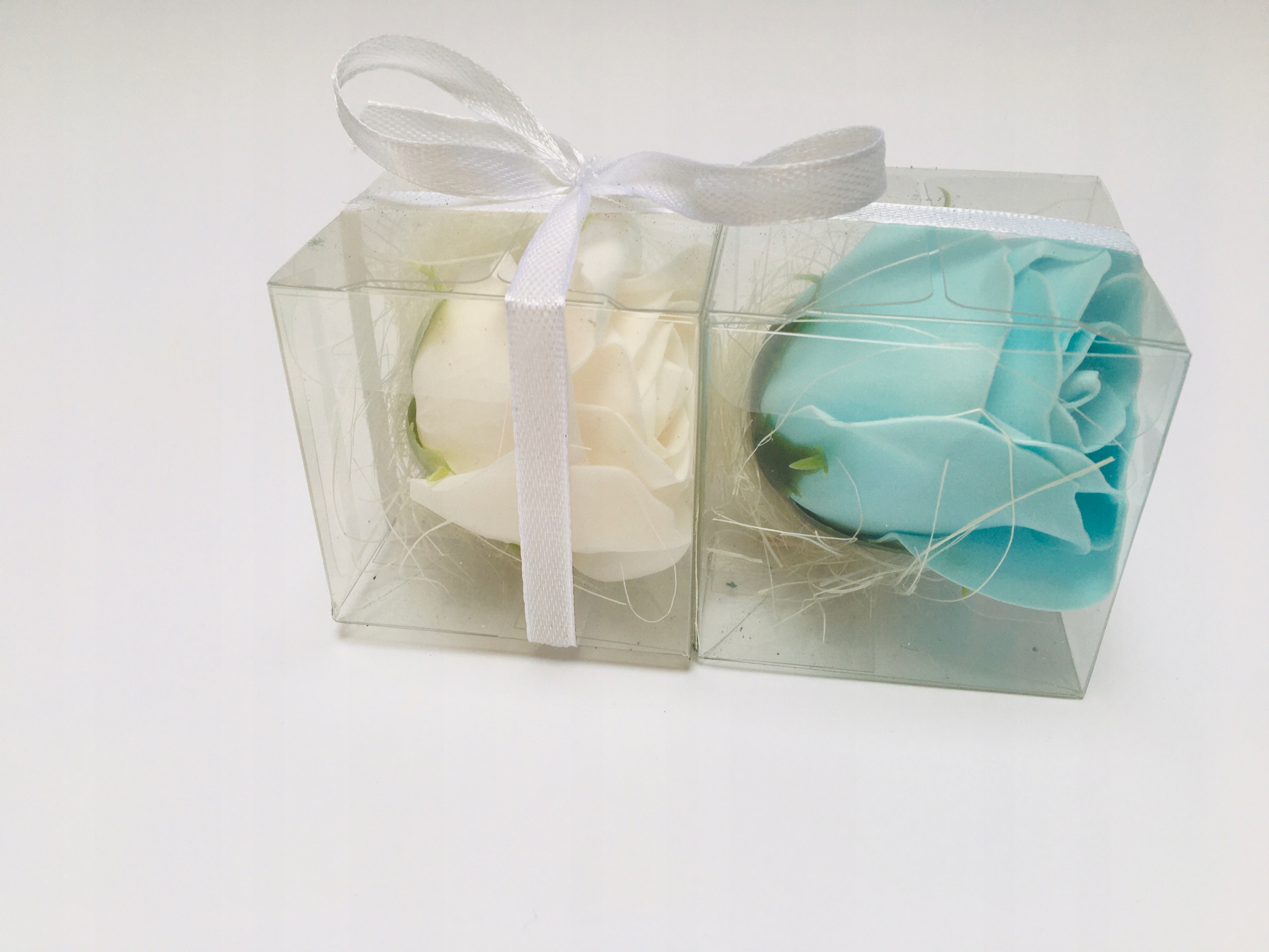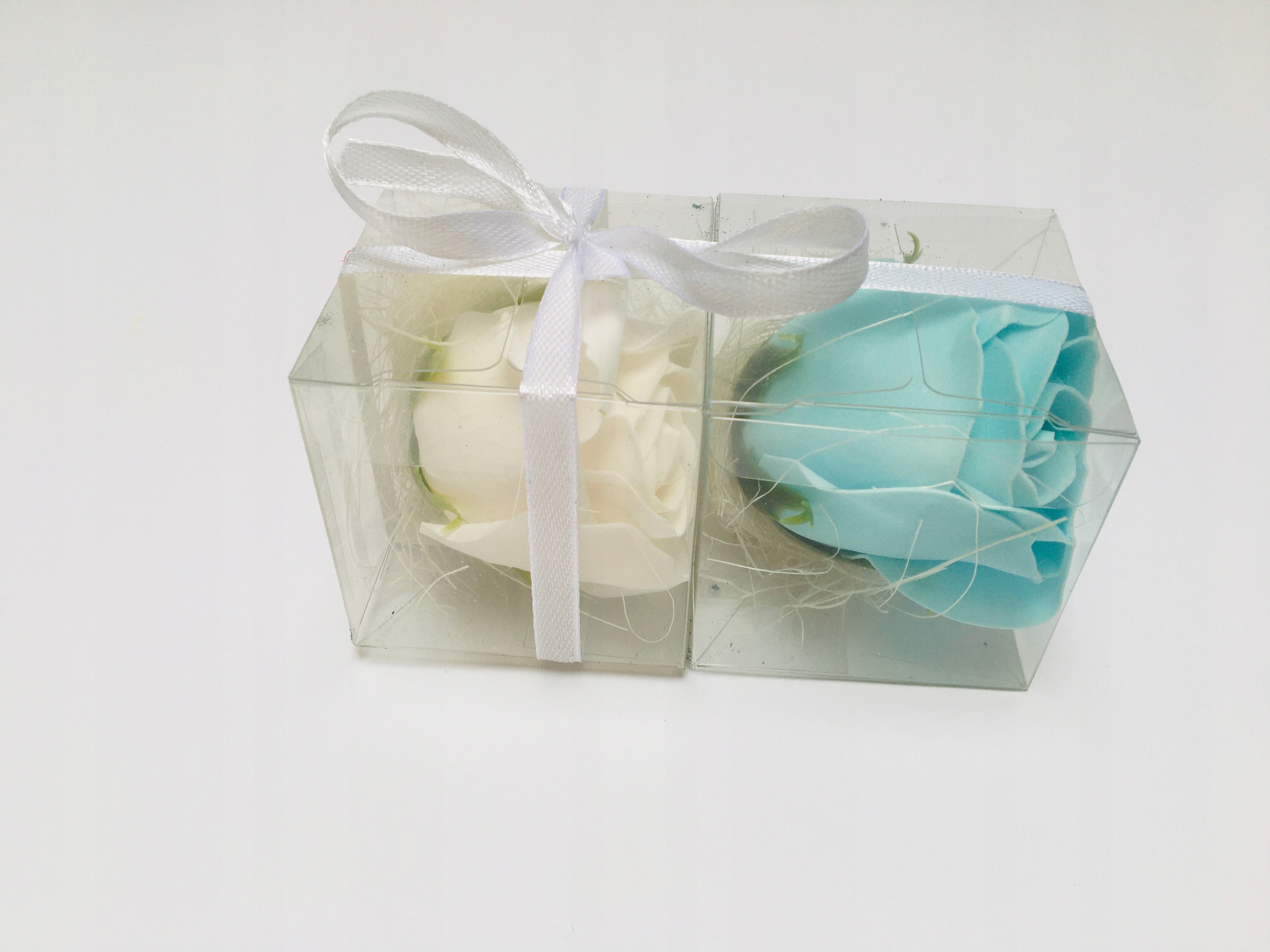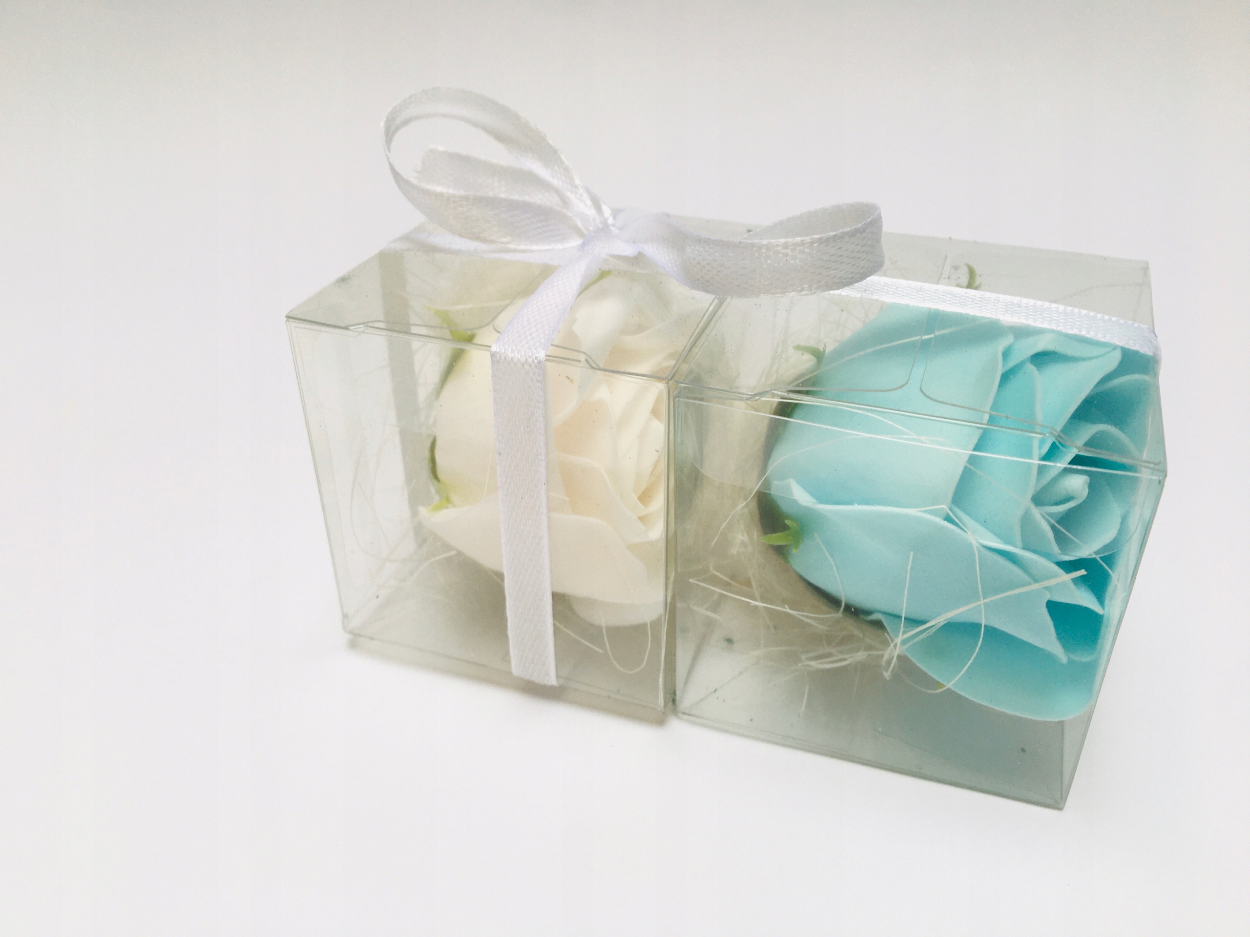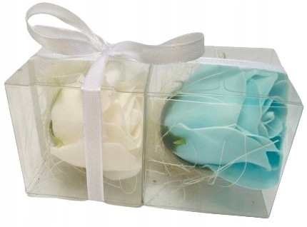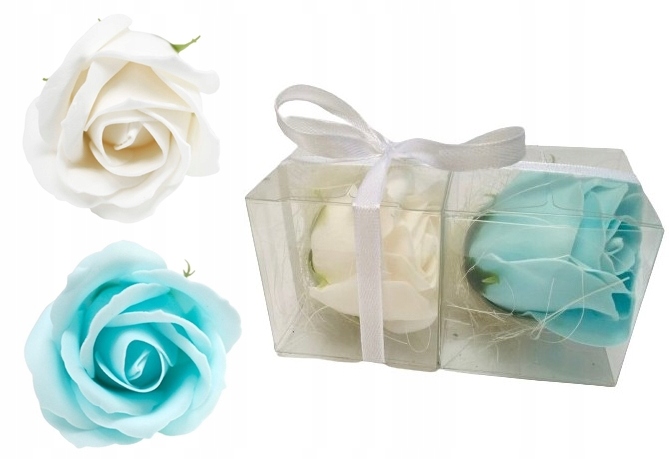 FLOWER BOX KWIATY MYDLANE RÓŻA BIAŁO NIEBIESKA na prezent upominek GOŚCI