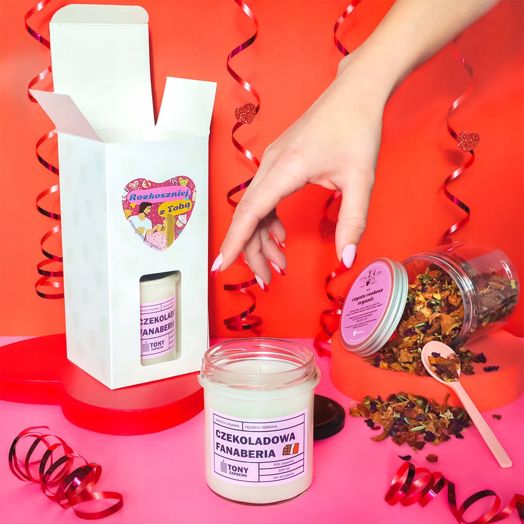 Zestaw prezentowy upominkowy "ROZKOSZNIEJ Z TOBĄ" herbata owocowa + świeca sojowa - prezent upominek na walentynki dla chłopaka dziewczyny niej niego żony męża kobiety faceta mężczyzny