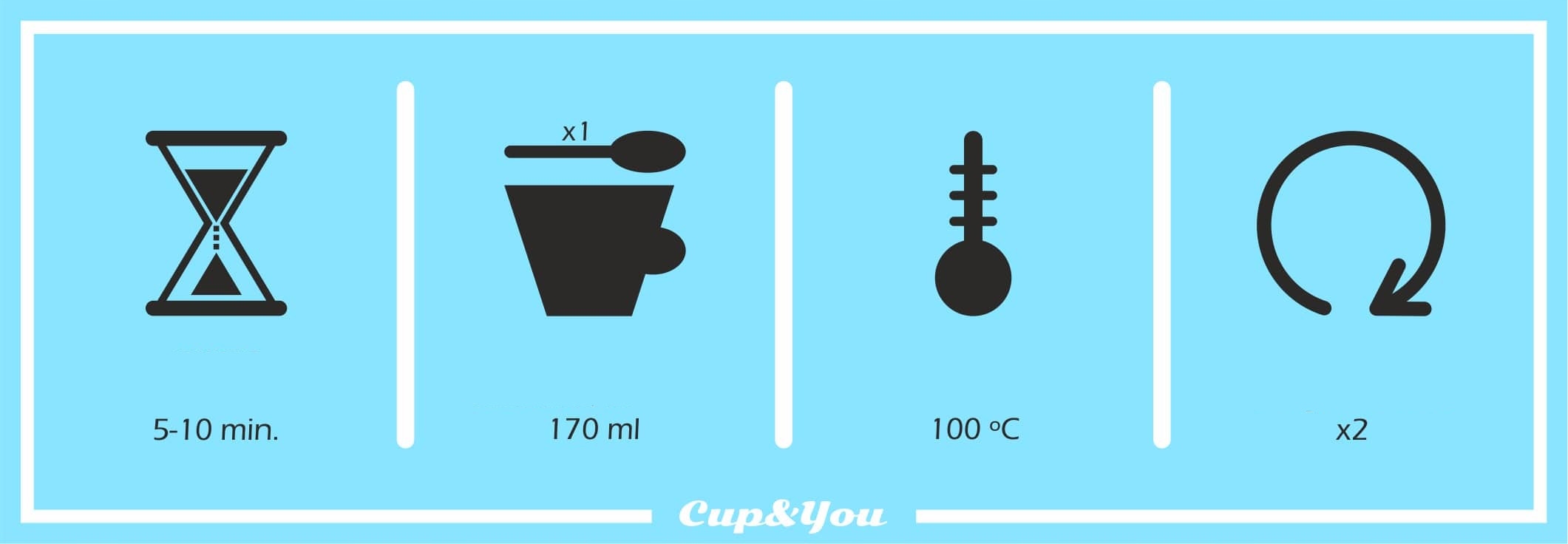 Parzymy wrzątkiem (100° C), 5-10 minut (w zależności od upodobań związanych z intensywnoscią naparu), 1 łyżeczka suszu na 170ml wody (mała filiżanka), można parzyć dwukrotnie.
