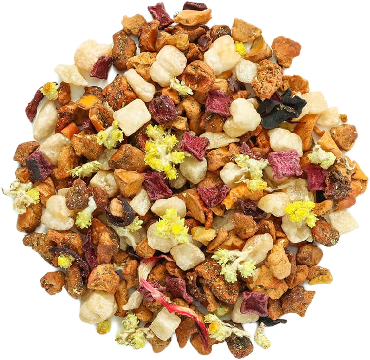- Hibiskus nadaje lekko kwaskowaty akcent i intensywną barwę naparu.