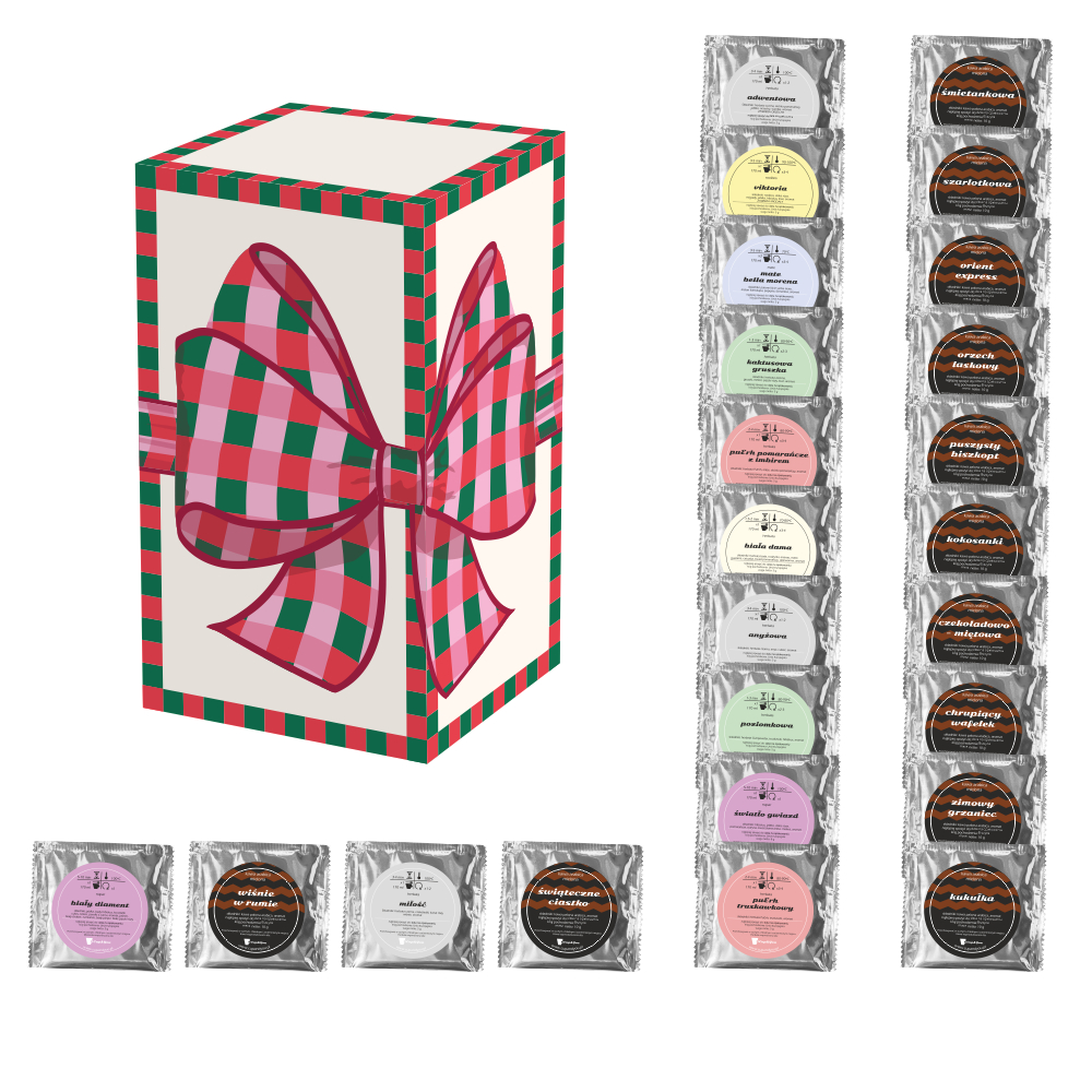 W środku czekają na Ciebie 12 różne herbaty sypane, w tym czarna, zielona, biała, rooibos, puerh, yerba mate i owocowa oraz 12 kaw aromatyzowanych o różnych smakach
