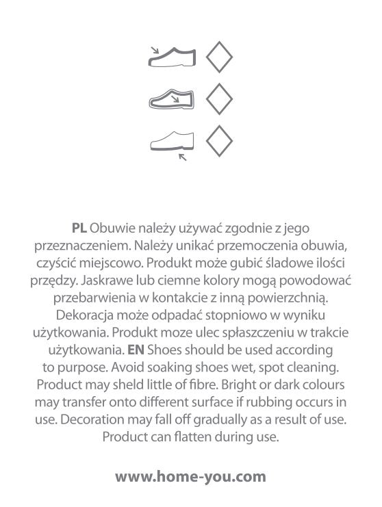 Produkt może gubić śladowe ilości przędzy podczas użytkowania. Jaskrawe lub ciemne kolory mogą powodować przebarwienia w kontakcie z inną powierzchnią (w tym ze skórami obiciowymi). Dekoracja może odpadać stopniowo w trakcie użytkowania. Kształt produktu może ulec zmianie podczas użytkowania. Czyścić miejscowo.