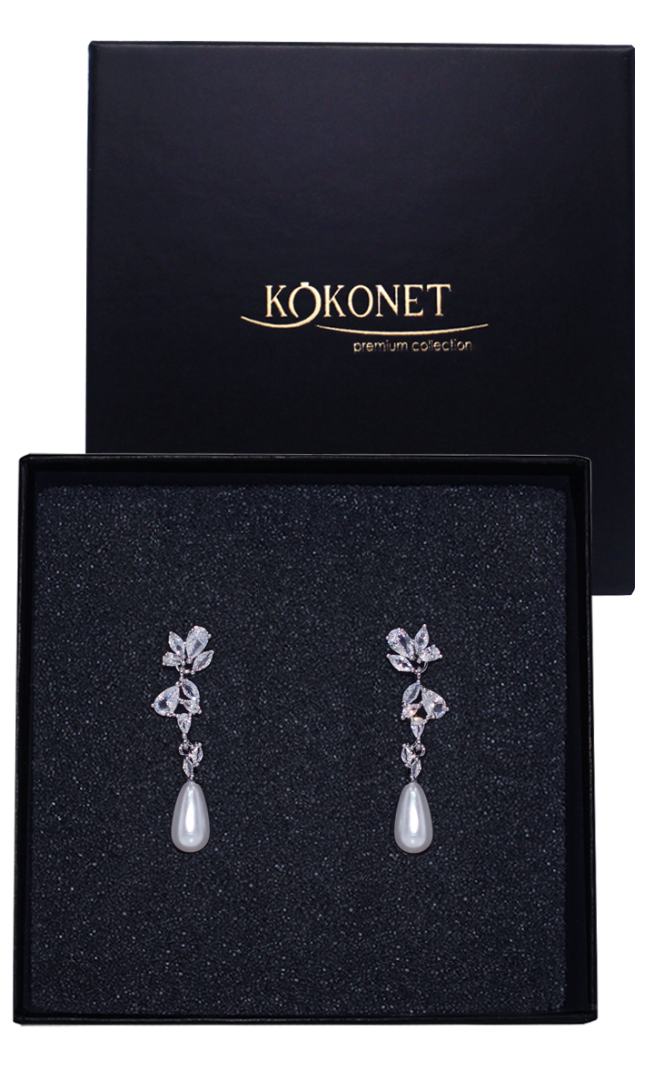 Kolczyki ślubne z wiszącą perłą srebrne na sztyft ślub rodowane błyszczące GLAM
