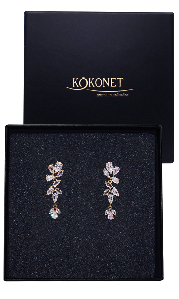 Kolczyki złote delikatne listki z cyrkoniami ślubne PREZENT pozłacane boho