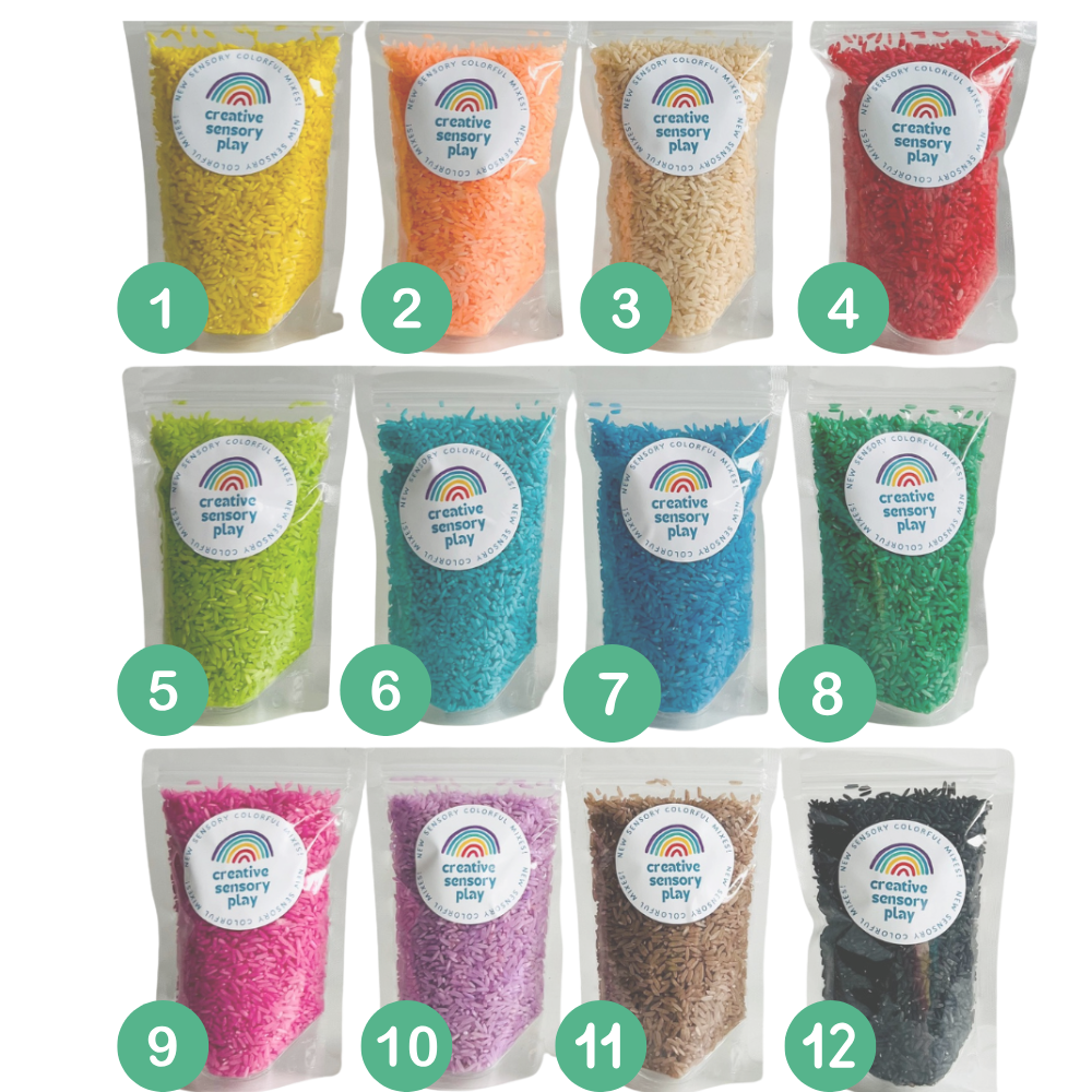 Kolorowy ryż sensoryczny barwiony jest za pomocą naturalny barwników spożywczych, dzięki temu jest w 100% bezpieczny dla dzieci.