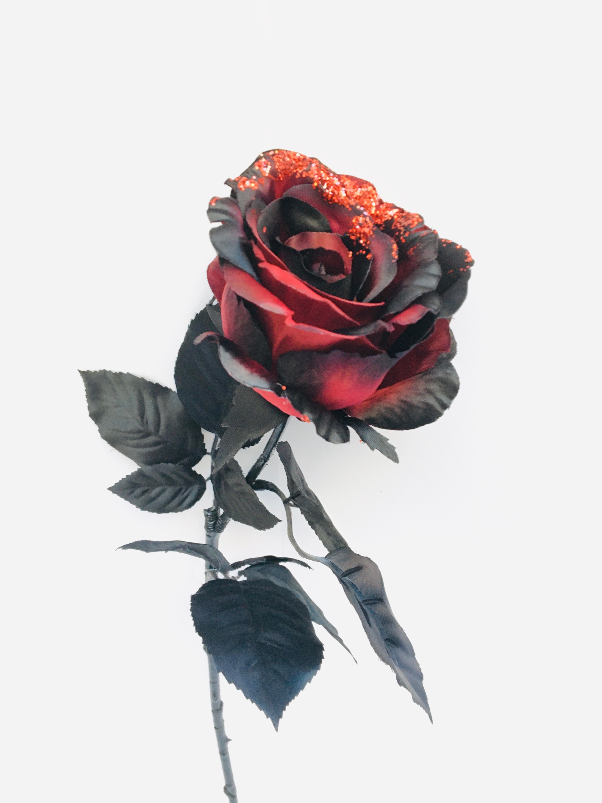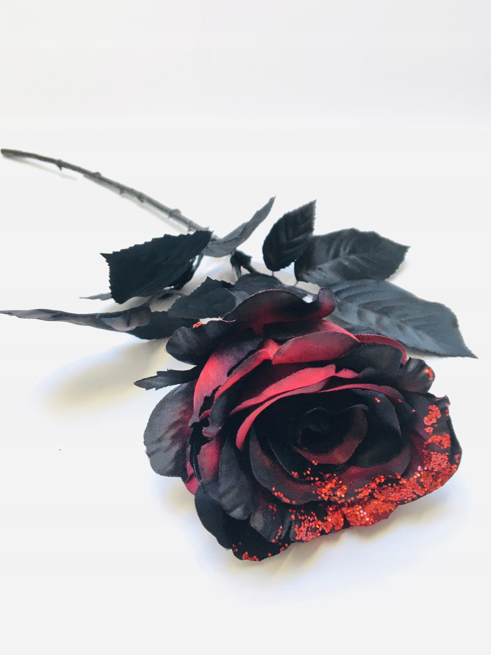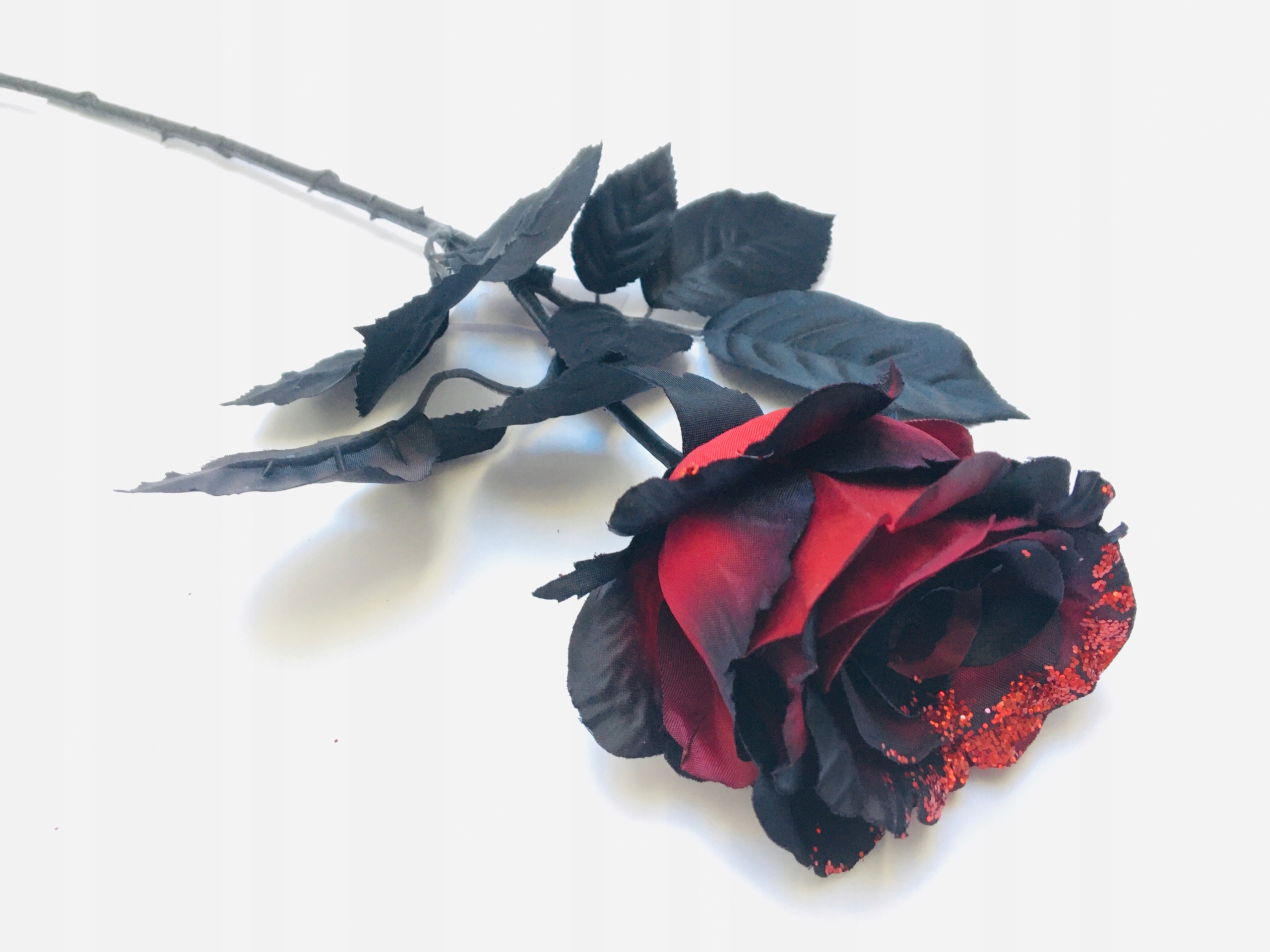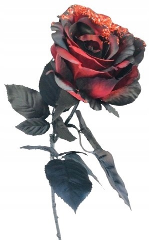 ŁODYGA RÓŻA Z BROKATEM czerwono czarna liść do flakonu wazonu święta 65cm