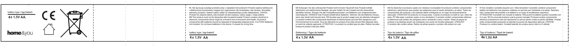 - Produkt działa na cztery baterie AA (brak w zestawie), dzięki czemu można go swobodnie ustawić bez konieczności podłączania przewodów.
