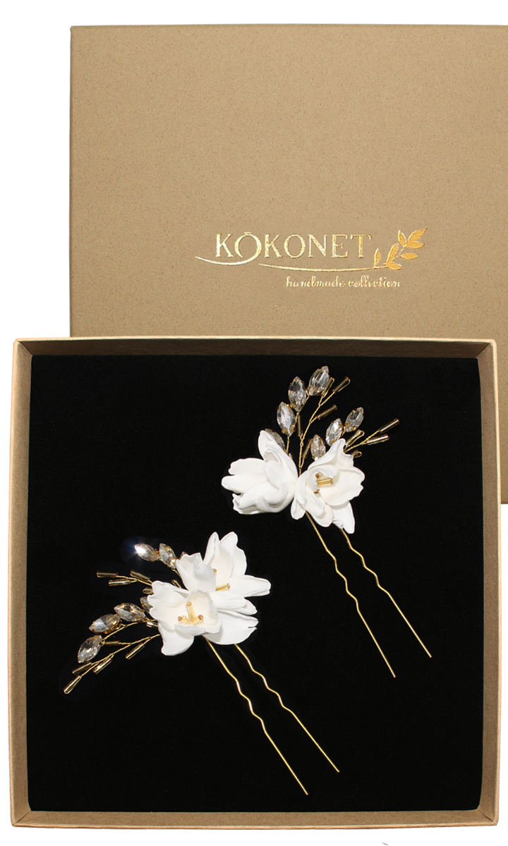 Ozdoba do włosów szpilki kokówki z kwiatami złote cyrkonie ręcznie robione