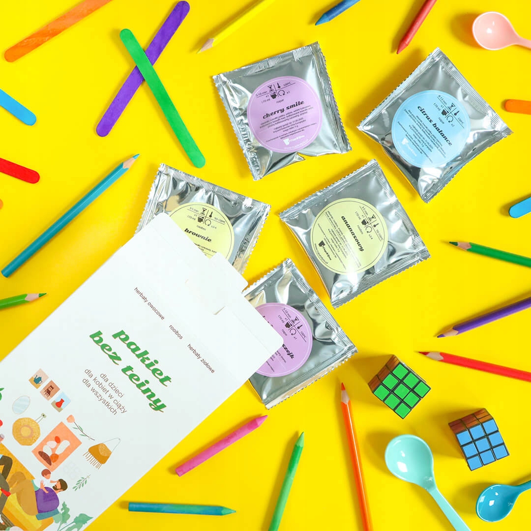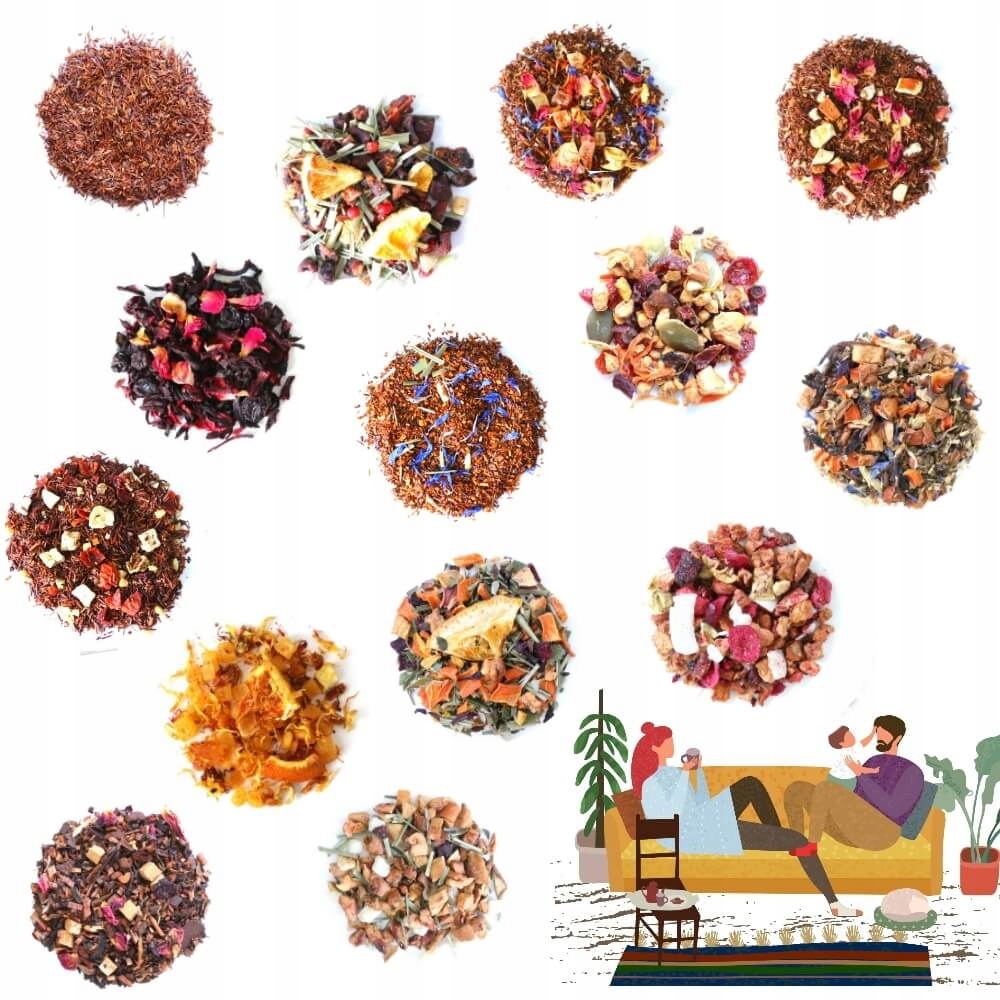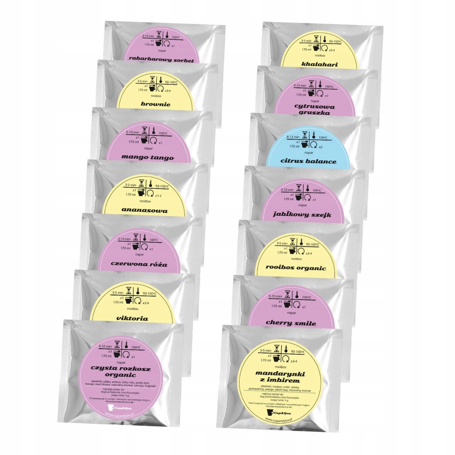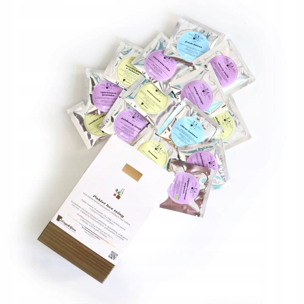 Pakiet bez teiny to 14 saszetek z herbatą różnego rodzaju i smaku: