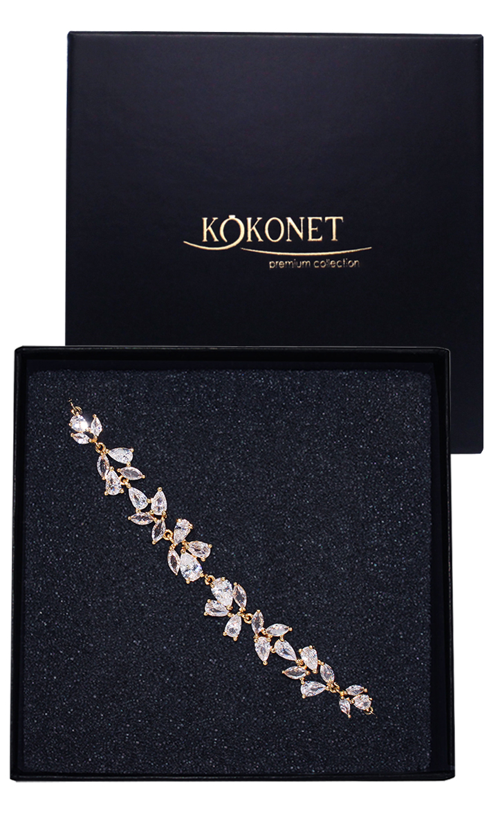 Pozłacana bransoletka ślubna regulowana listki cyrkonie kryształki PREZENT