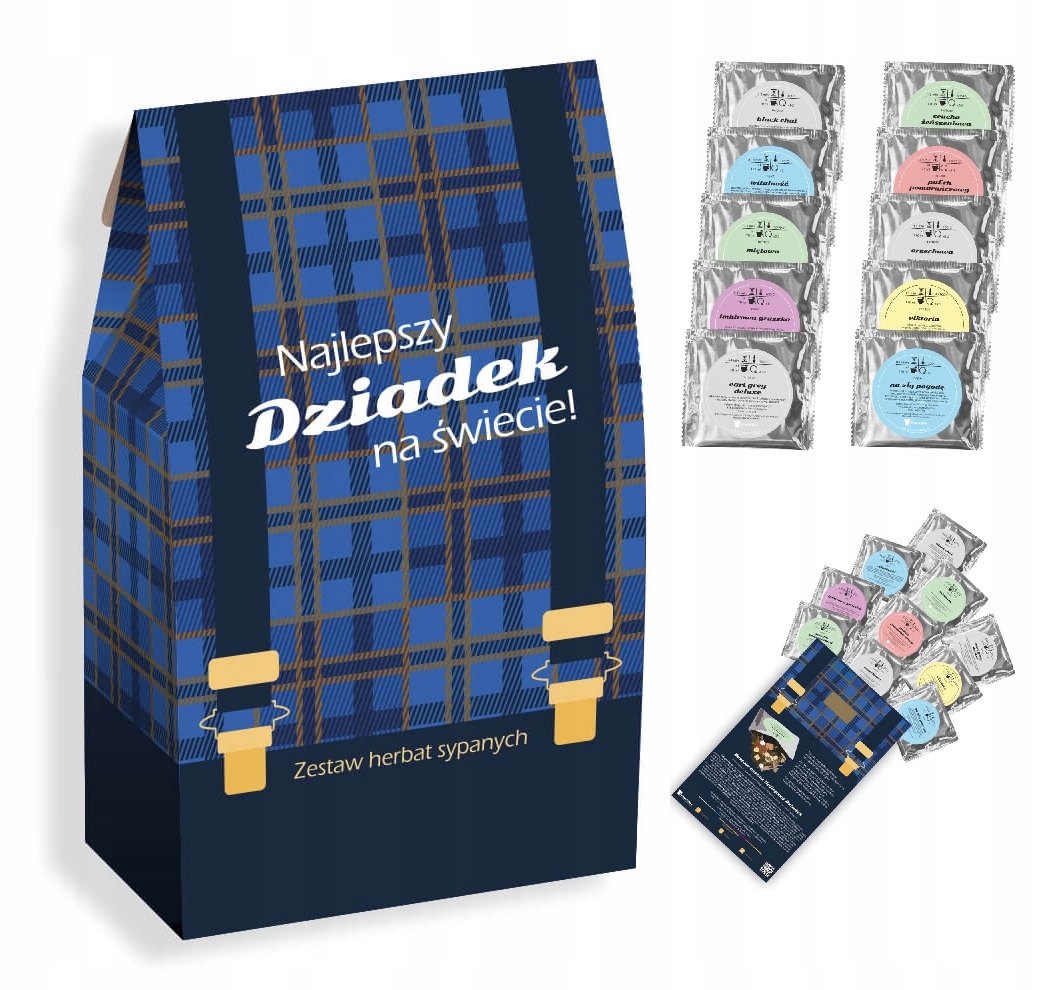 ✨ Zestaw herbat NAJLEPSZY DZIADEK to kompozycja 10-ciu saszetek z herbatą sypaną w różnych rodzajach i smakach.