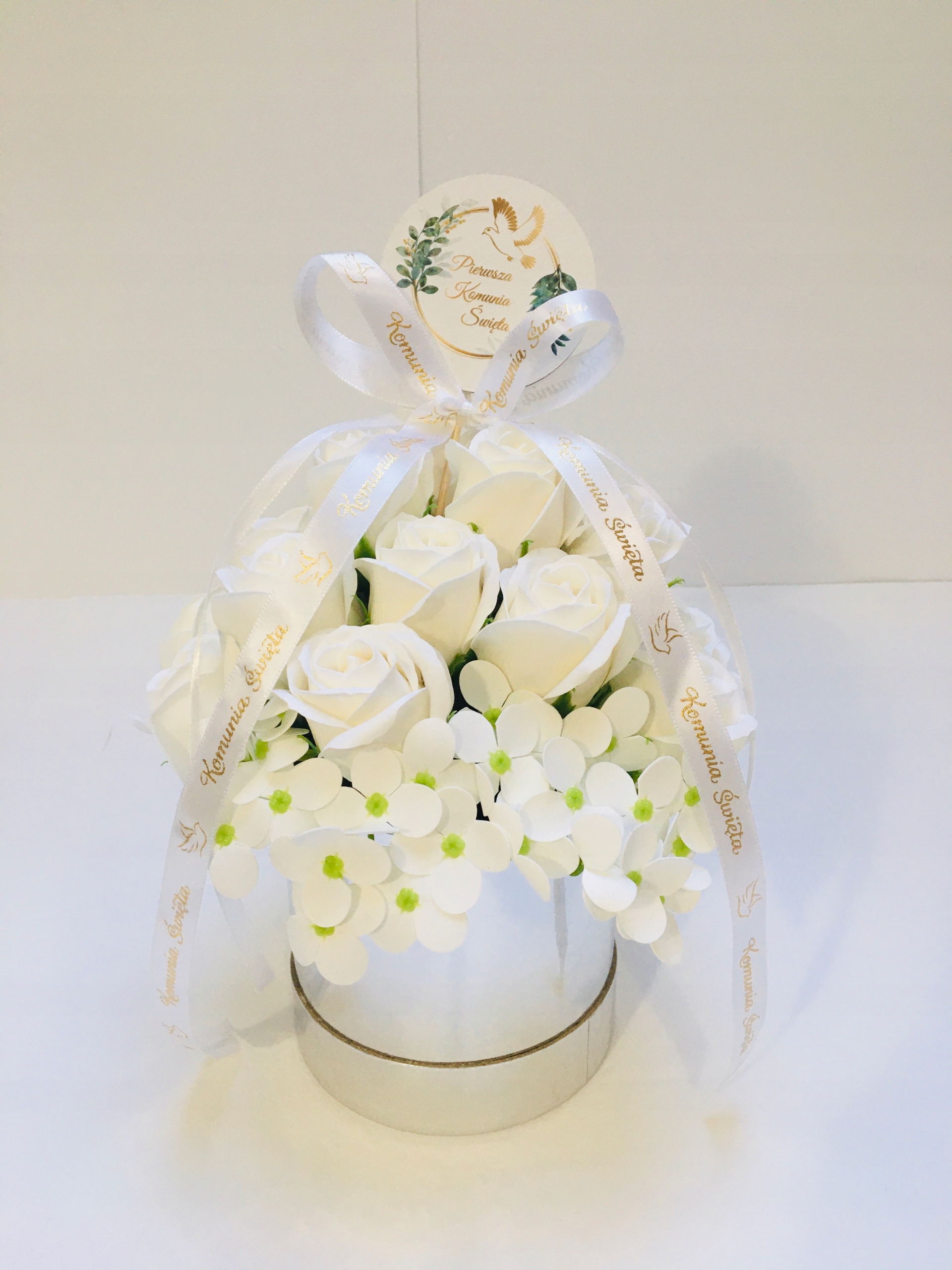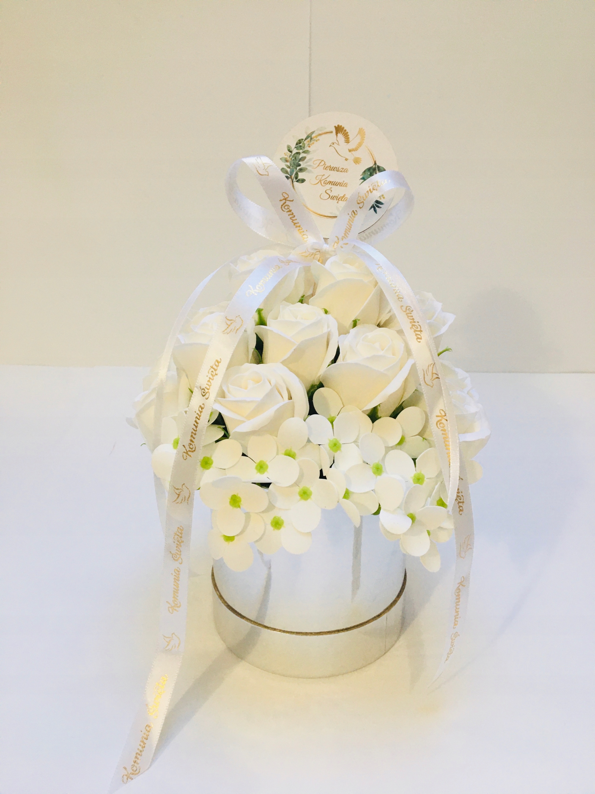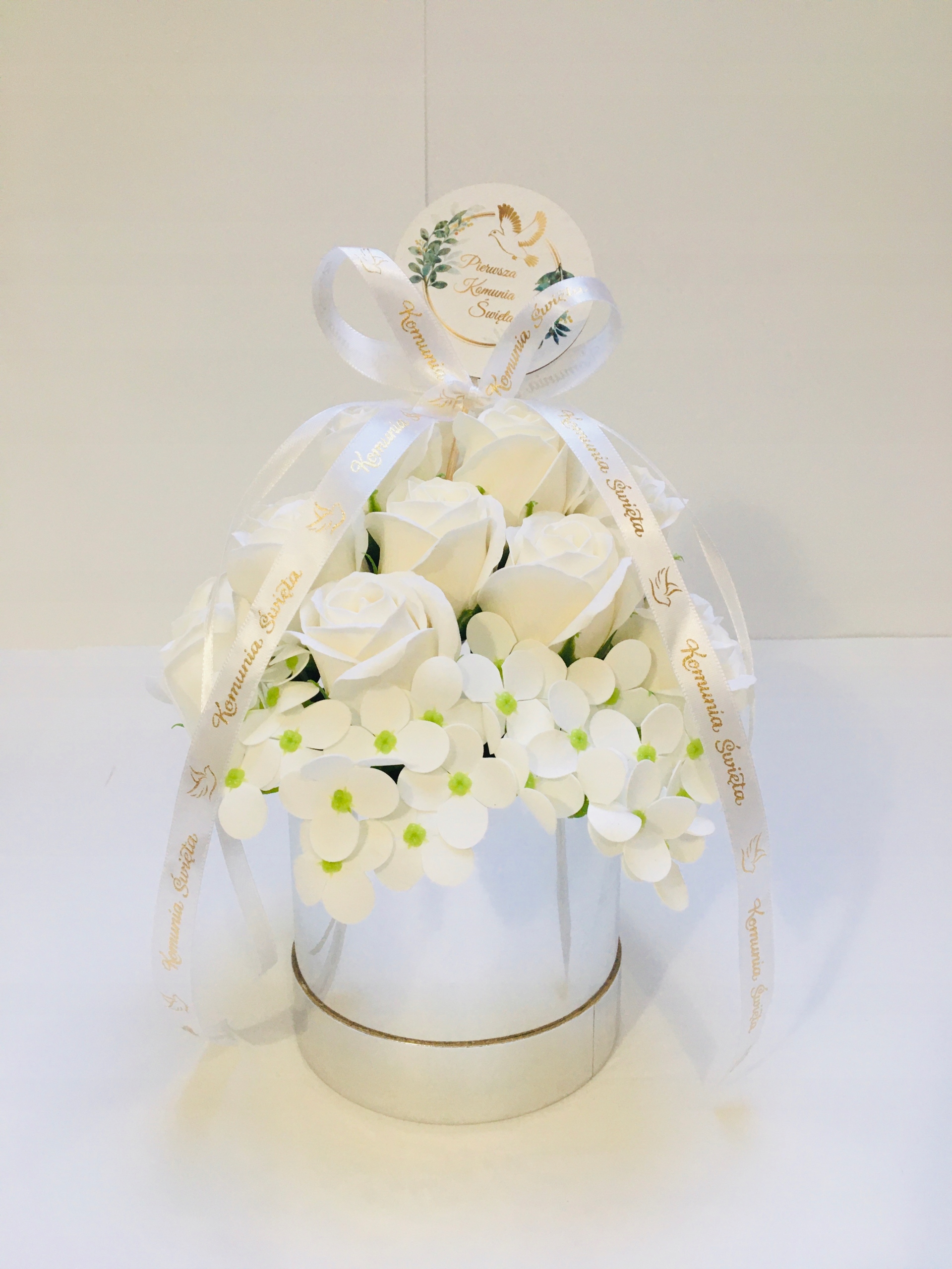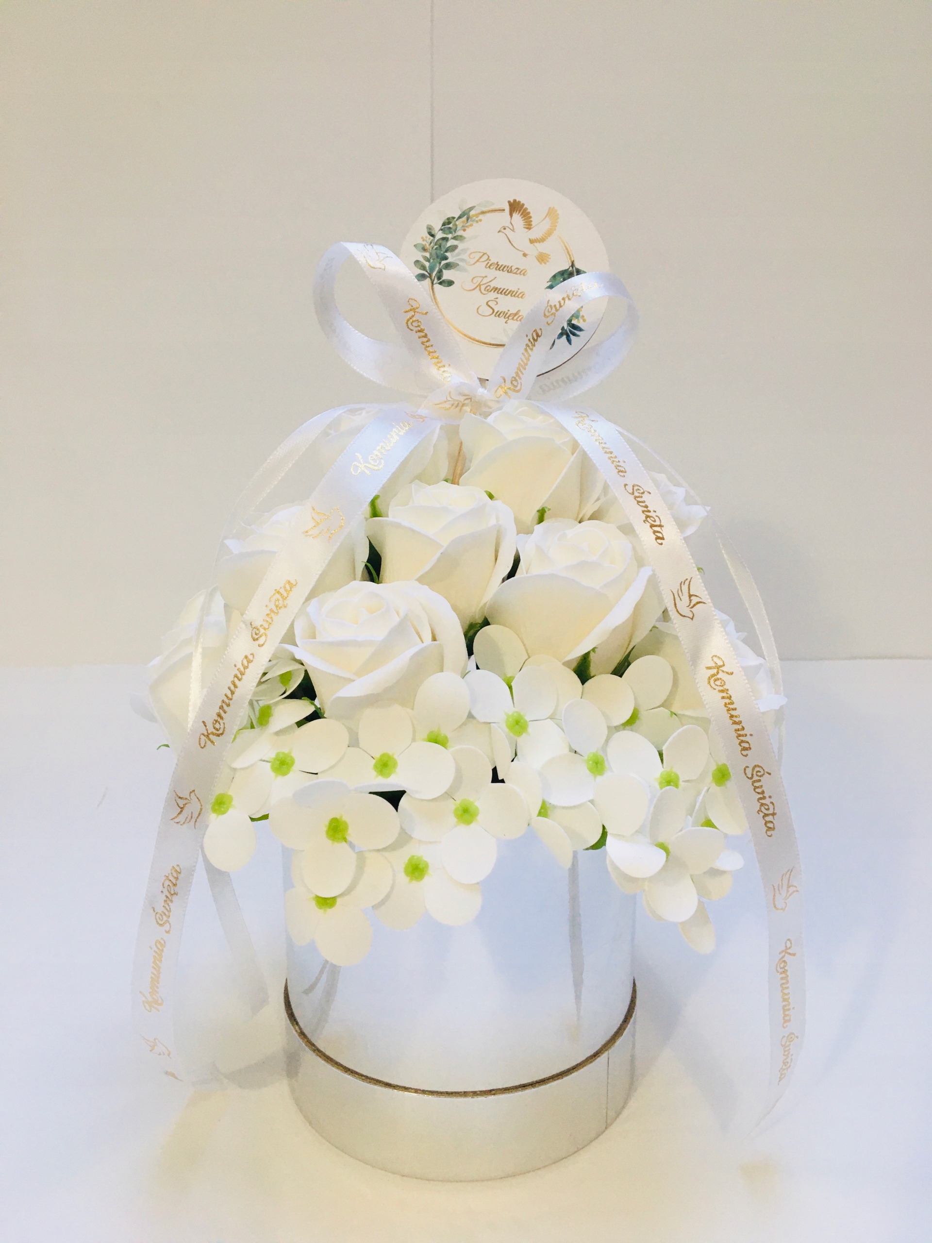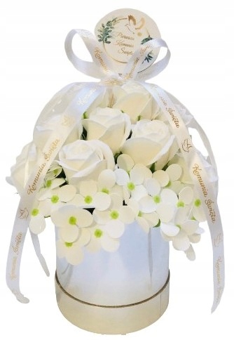 RÓŻE mydlane BIAŁE w srebrnym pudełku na I KOMUNIA ŚWIĘTA prezent pamiątka
