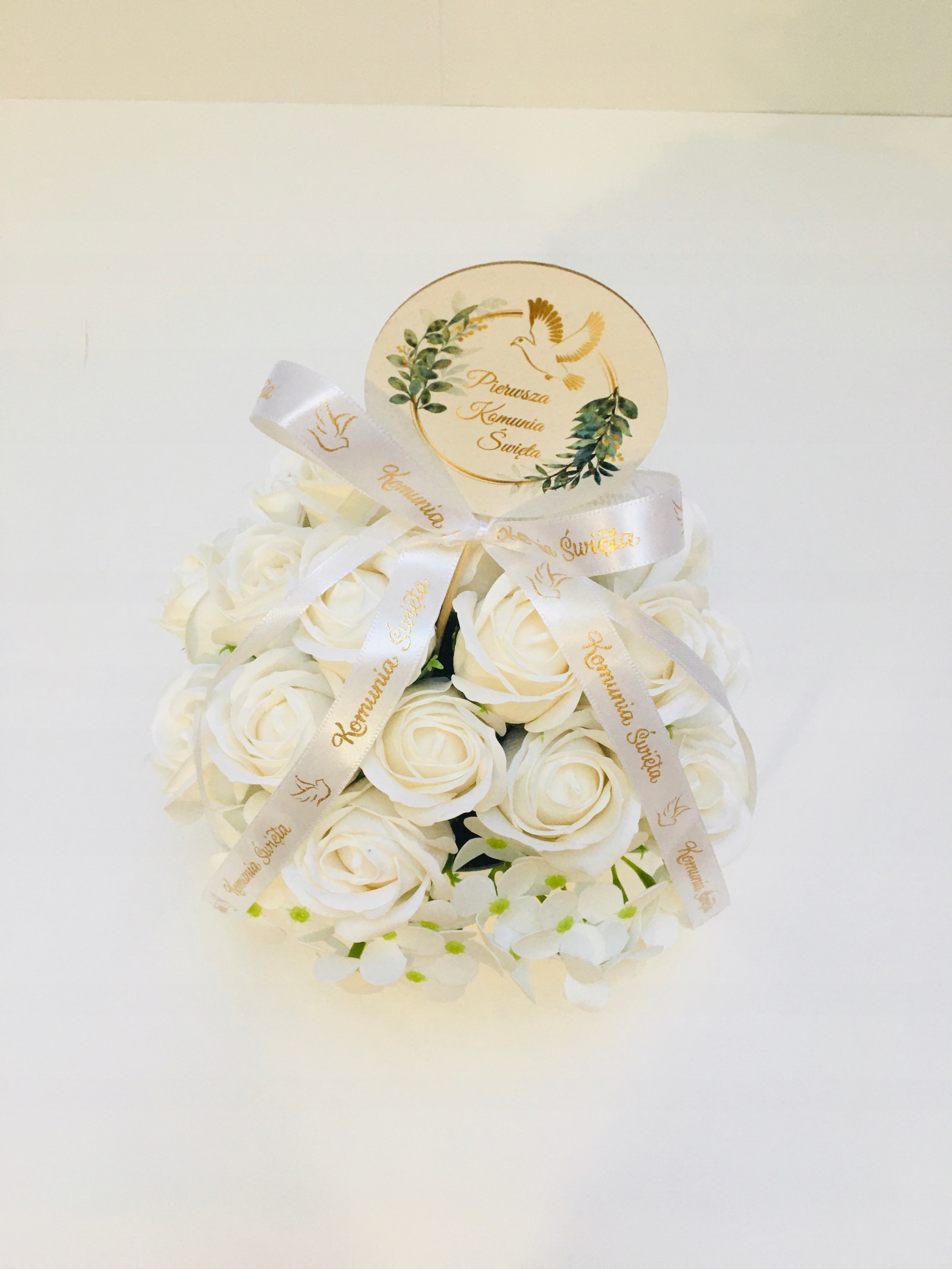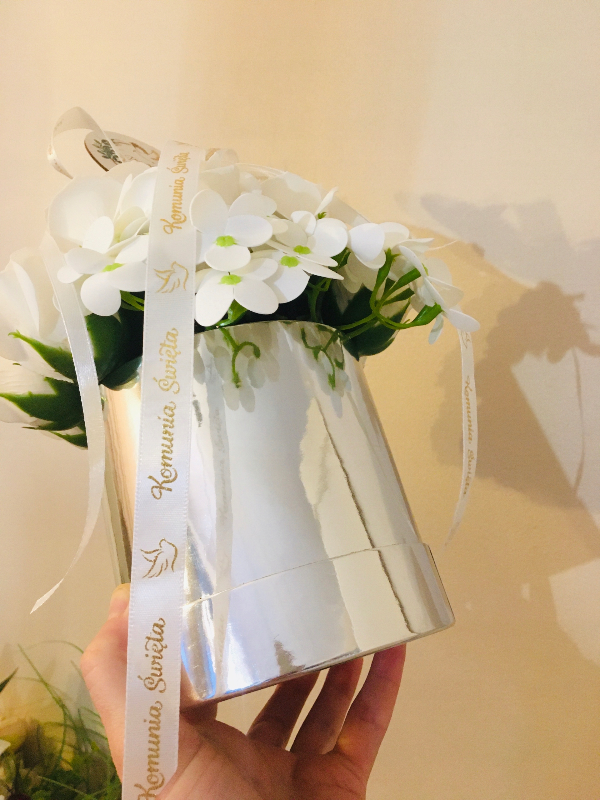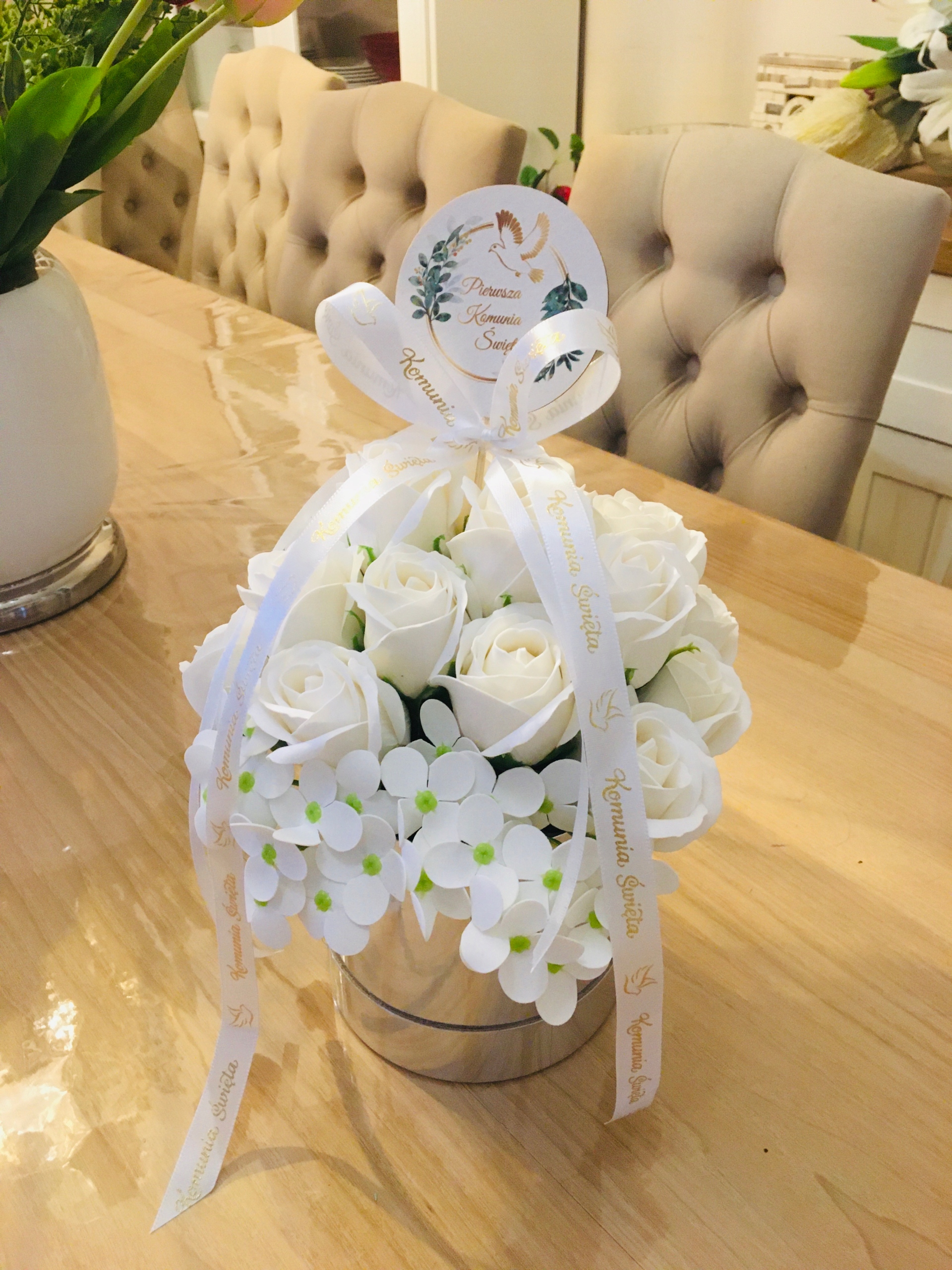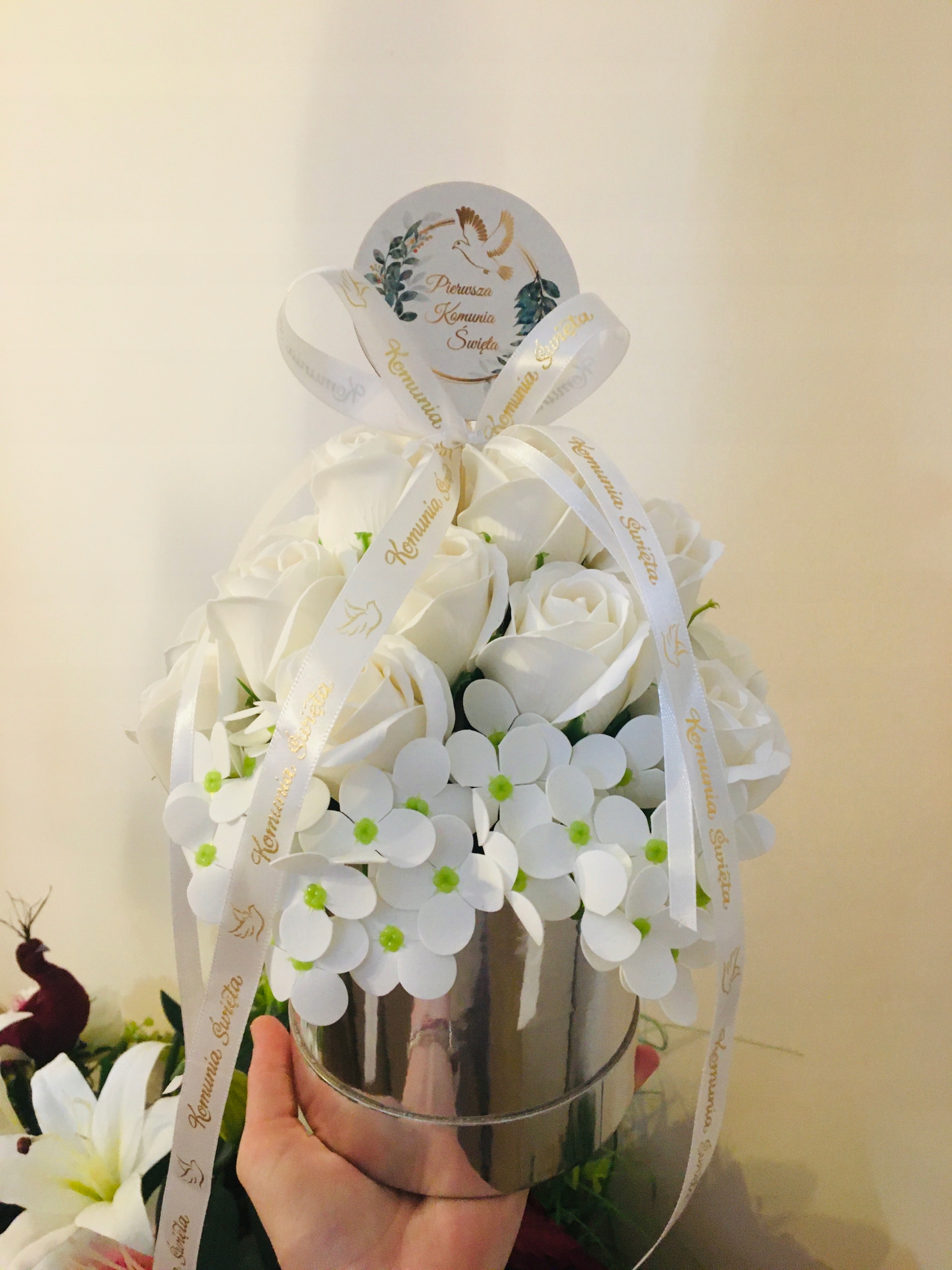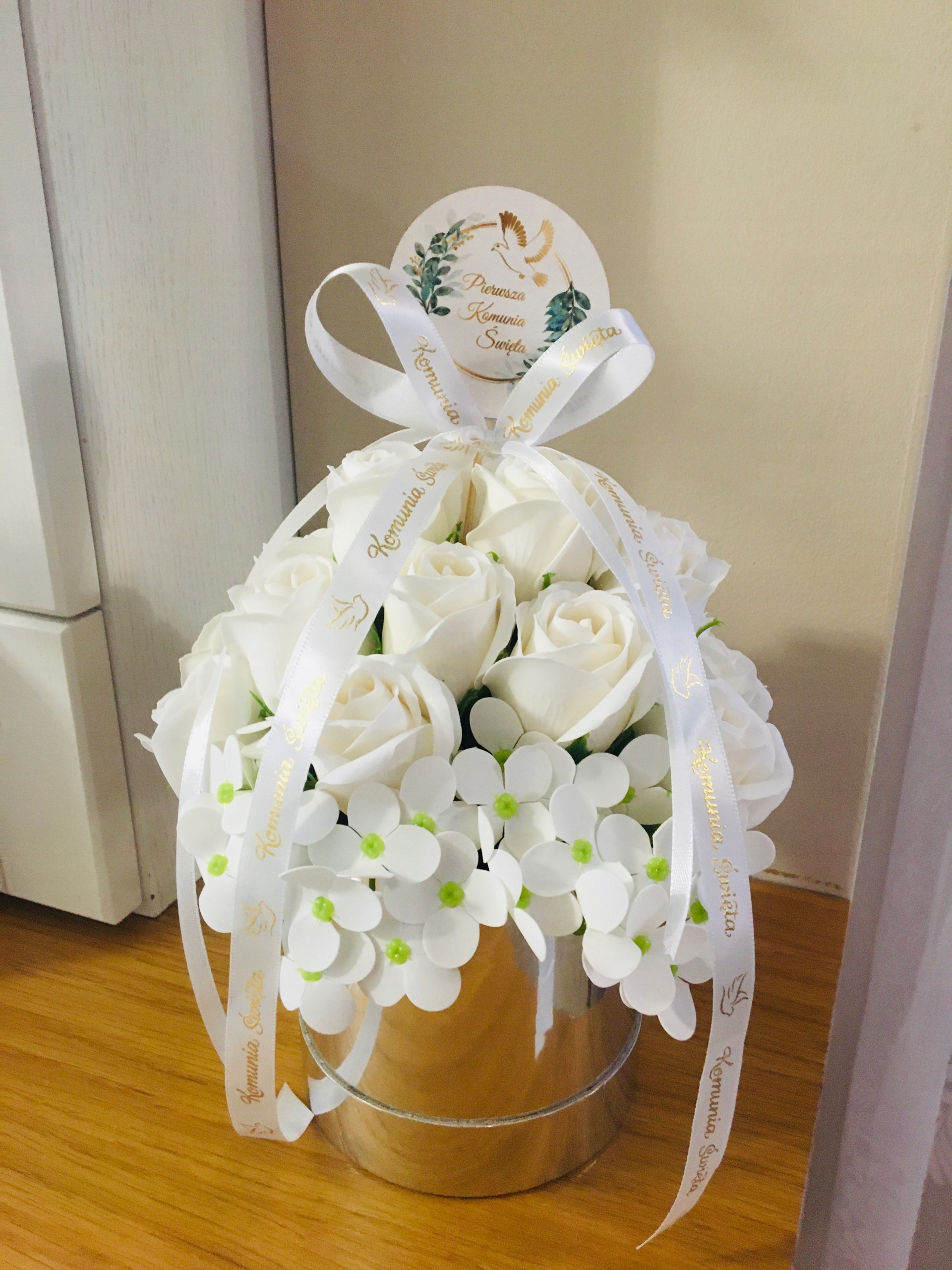 RÓŻE mydlane BIAŁE w srebrnym pudełku na I KOMUNIA ŚWIĘTA prezent pamiątka