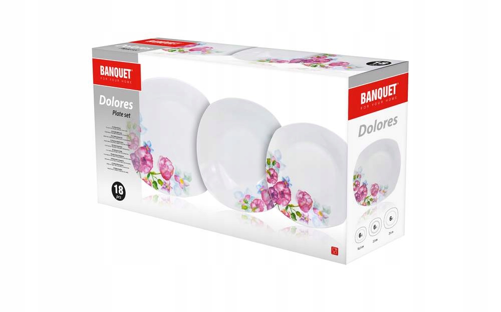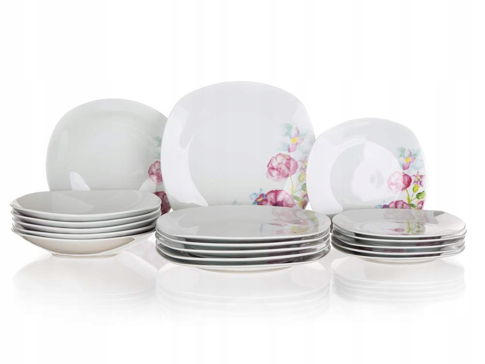 TALERZE OBIADOWE KOMPLET dla 6 osób W KWIATY KWADRATOWE białe serwis