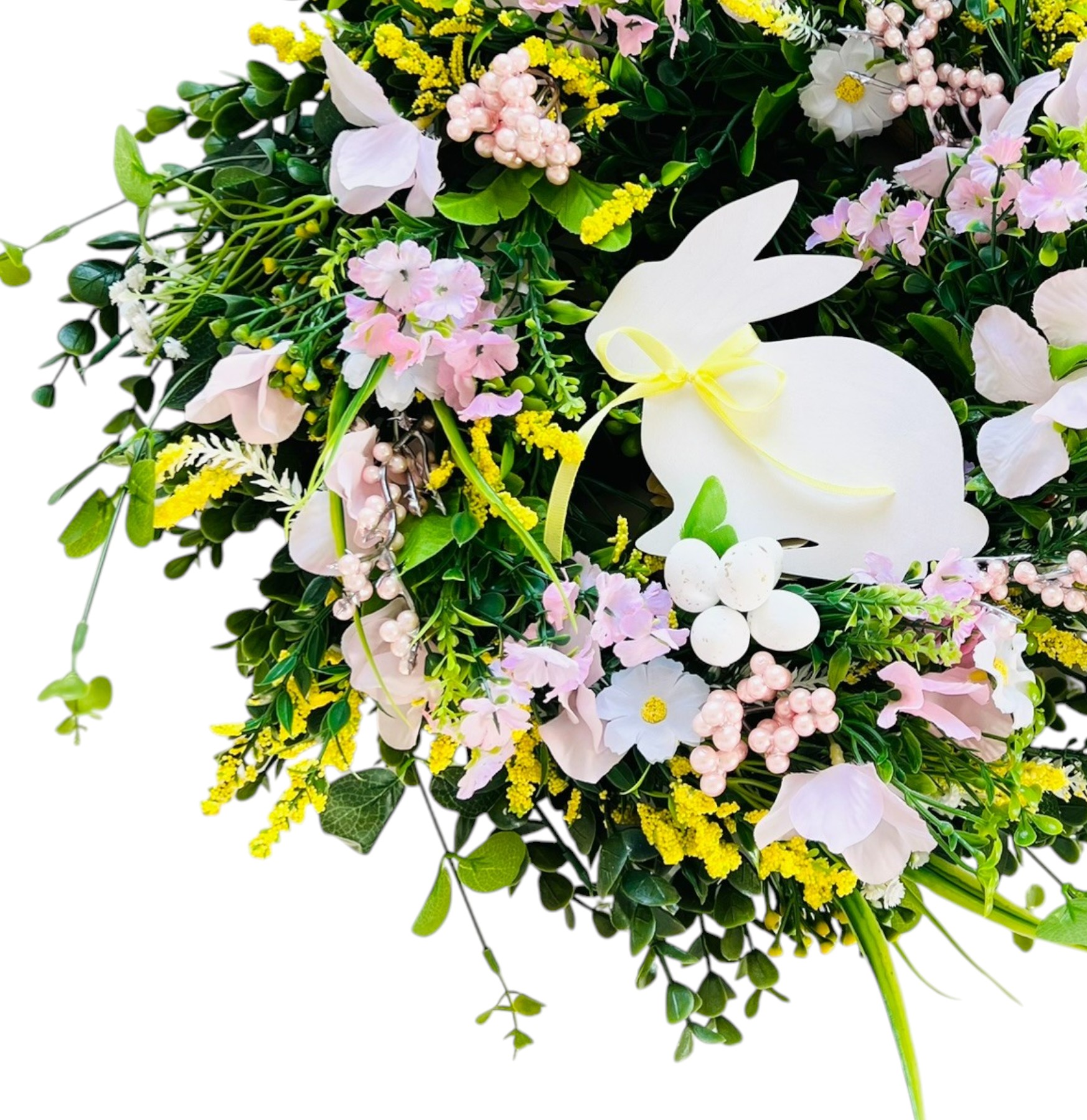 ✅ materiał - kilka rodzajów sztucznych gałązek zielonych (bukszpan, eukaliptus), sztuczne kwiaty w odcieniu żółtego i różowego oraz drewiany królik z kokardką (ozdoba jest wbita na piku w podstawę, można z łatwością zdemontować po Wielkanocy)