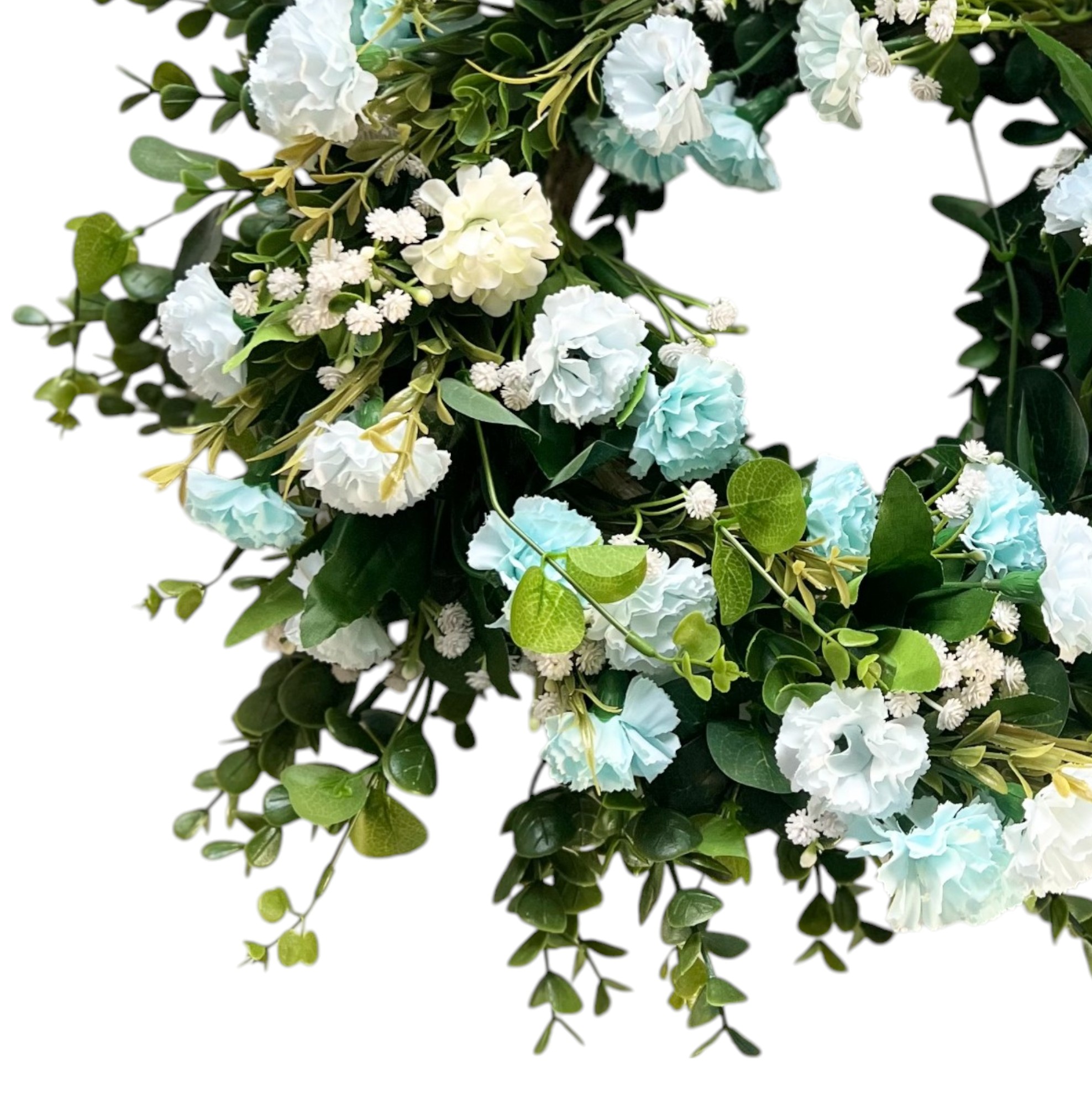 ✅ materiał - kilka rodzajów sztucznych gałązek zielonych (bukszpan, eukaliptus) oraz sztuczne kwiaty (gożdziki, gipsówka)