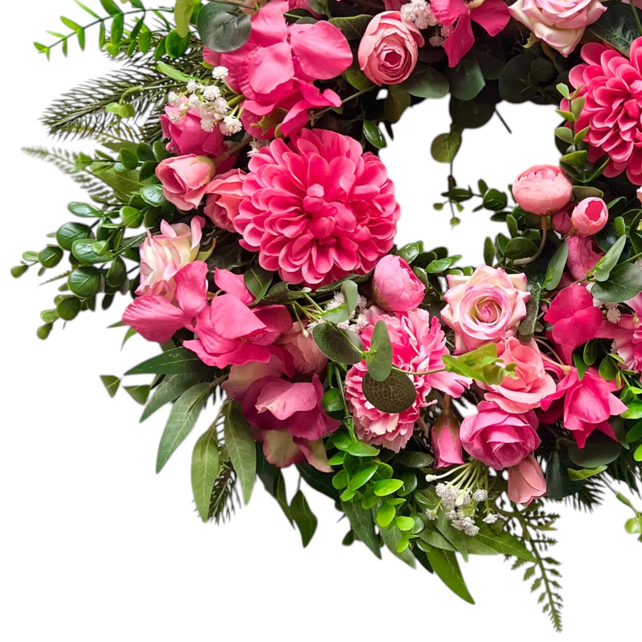 ✅ materiał - kilka rodzajów sztucznych gałązek zielonych (bukszpan, eukaliptus, paproć) oraz różnorodne kwiaty (m.in. róże, hortensje, piwonie, gipsówka, dalie)