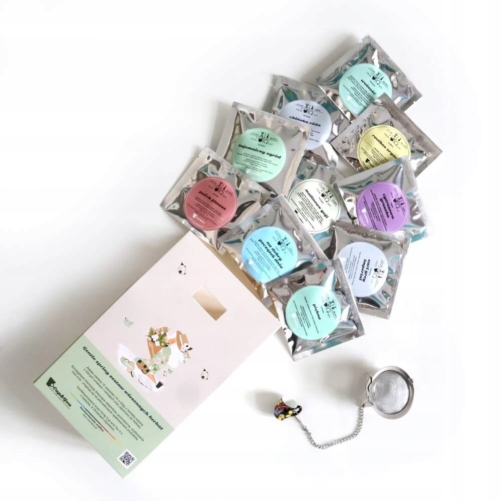 ✅ Zestaw wiosennych herbat Gentle Spring: 10 saszetek – 10szt x 5/8g z różnymi rodzajami i smakami herbat oraz zaparzacz z zawieszką