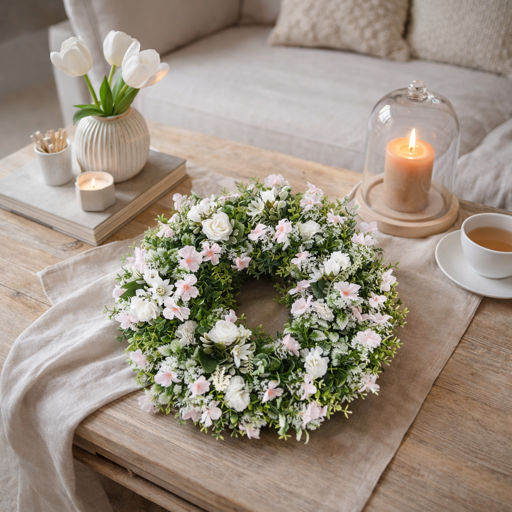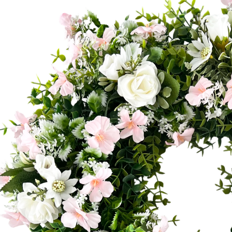 Wiosenny wianek wielkanocny MAYA Ø45 cm – wiosenny, naturalny Delikatny, świeży i niezwykle elegancki wianek dekoracyjny w jasnej, romantycznej kolorystyce. Połączenie bieli, subtelnego pudrowego różu oraz soczystej zieleni tworzy lekką, harmonijną kompozycję idealną na sezon wiosenny i letni. Wianek jest pełny, przestrzenny i bardzo realistyczny – kwiaty zostały ułożone warstwowo, dzięki czemu dekoracja prezentuje się naturalnie i efektownie z każdej strony. Wianek wykonany z wysokiej jakości sztucznych kwiatów: białe róże, drobne jasnoróżowe kwiaty ozdobne, białe kwiaty wypełniające, zielone listki dekoracyjne, gałązki bukszpanu w różnych odcieniach zieleni oraz stabilna, plastikowa baza florystyczna. Wianek doskonale sprawdzi się jako: dekoracja drzwi wejściowych, ozdoba ściany w salonie lub sypialni, romantyczny akcent nad komodą lub dekoracja całoroczna. https://upload.cdn.baselinker.com/products/5001972/62bb002df0a639d11f0b70b763e5caf6.png
