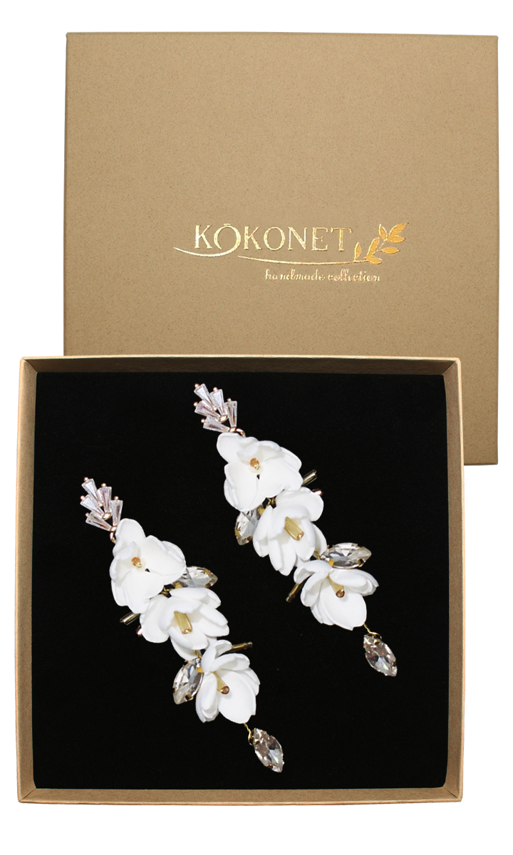 Kolczyki z białymi kwiatami i cyrkoniami FRESJA gold stanowią połączenie elegancji ze stylem rustykalno - romantycznym. Ręcznie splecione kwiaty razem z kryształkami i błyszczącymi kwiatami dopełnią Twoją ślubną stylizację o absolutnie uroczą biżuterię. Jeśli Twoja suknia posiada motyw kwiatów 3d, czy wykonana jest ze zwiewnych materiałów, to z pewnością wybór tej biżuterii ślubnej będzie trafny.