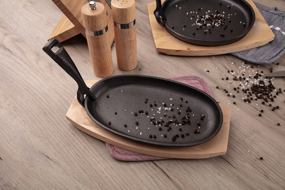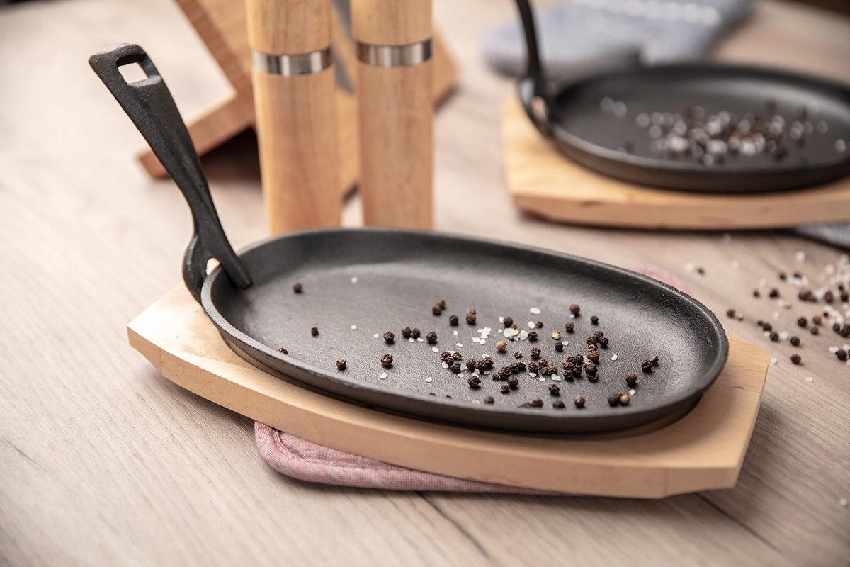 żeliwna patelnia talerz na desce serwowanie mięso warzywa kolacja obiad box