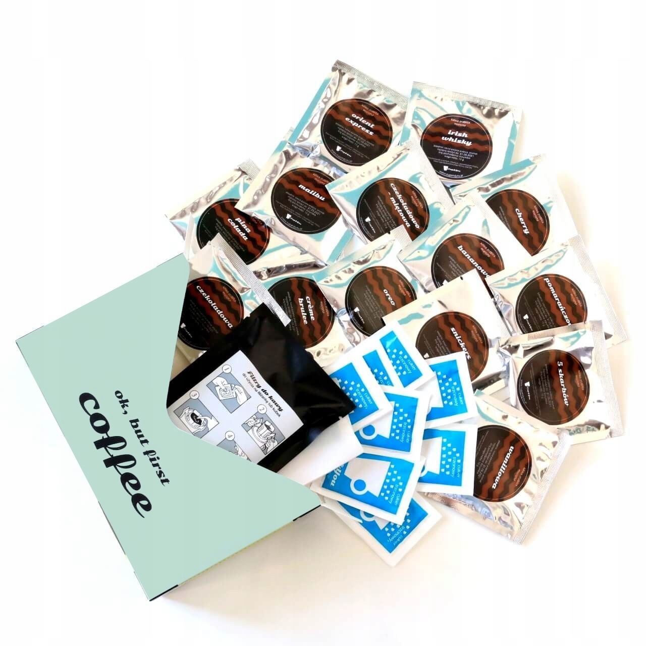 ZESTAW 14 SMAKÓW KAW DESEROWYCH DLA PODRÓŻNIKA TURYSTY NA WYJAZD + ZAPARZACZE I CUKIER - PREZENT UPOMINEK DLA KOBIETY FACETA