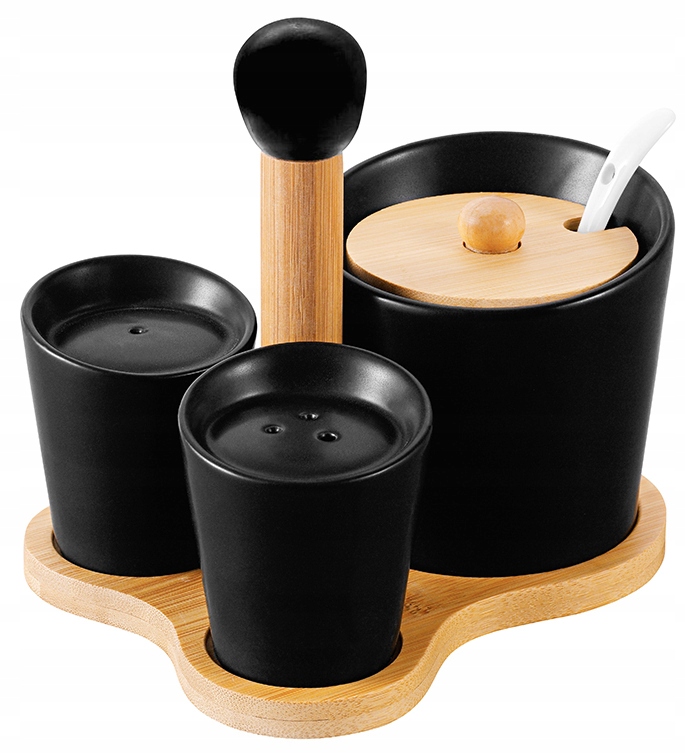 ZESTAW cukiernica solniczka pieprzniczka na bambusie podstawka CZARNY box