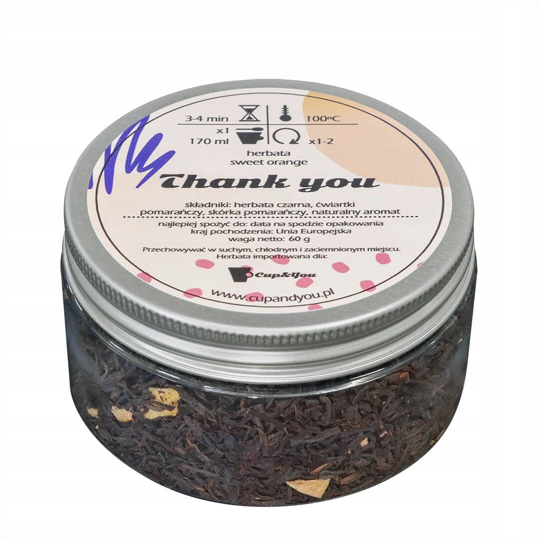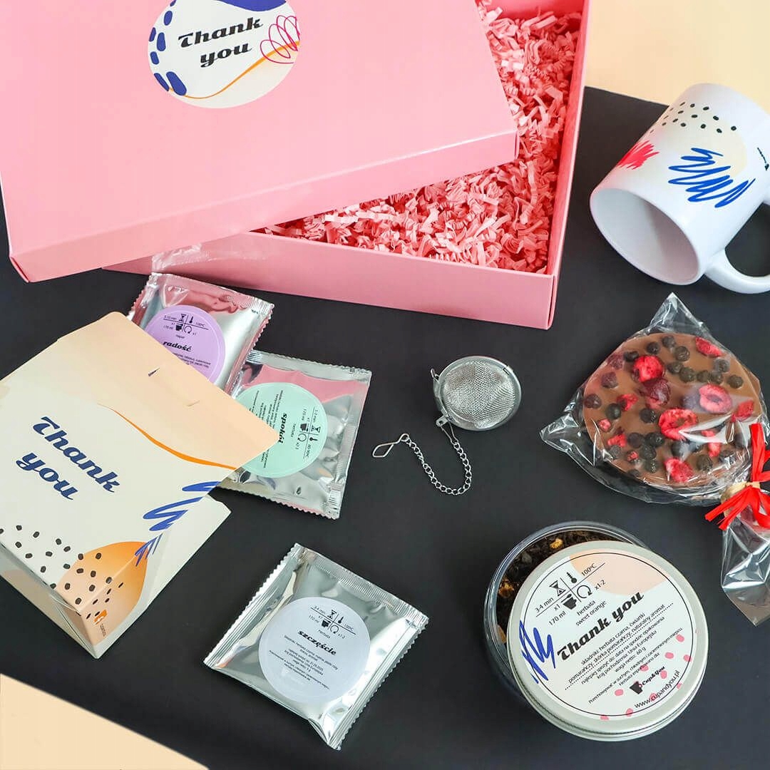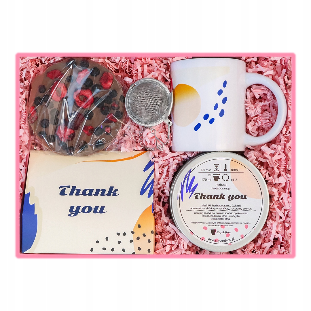 Zestaw prezentowy box "THANK YOU" z herbatami sypanymi kubkiem i czekoladą z owocami - podziękowanie prezent upominek dla kobiety dziewczyny niej