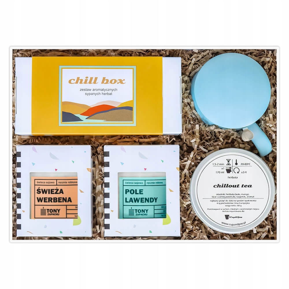 ZESTAW PREZENTOWY UPOMINKOWY "BIG CHILL BOX" - HERBATA SYPANA 2X ŚWIECA SOJOWA KUBEK Z ZAPARZACZEM I POKRYWKĄ - PREZENT UPOMINEK DLA KOBIETY FACETA NIEJ NIEGO