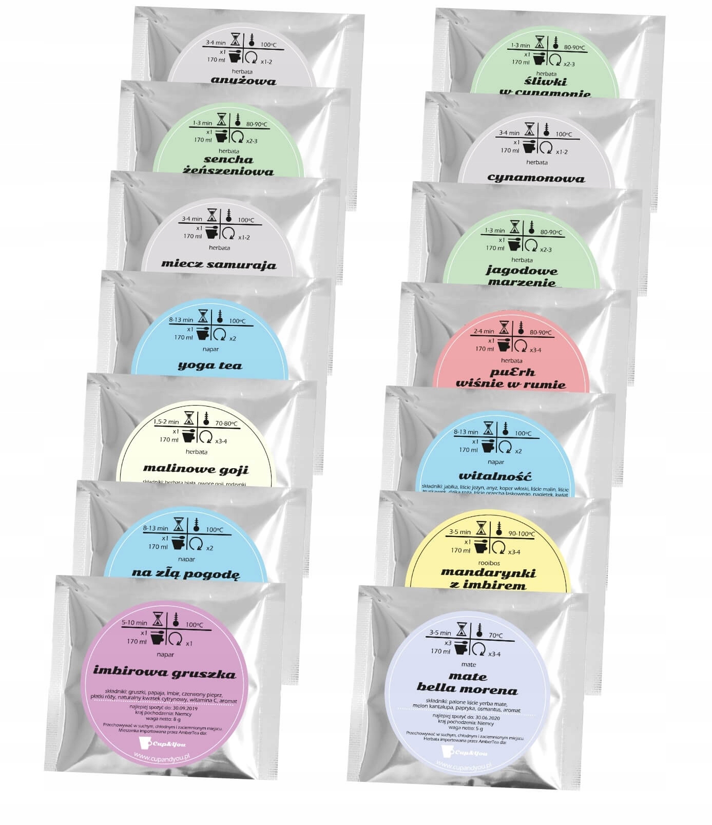 • Każda herbata zapakowana jest w oddzielną saszetkę z dokładnym opisem oraz instrukcją dotyczącą parzenia