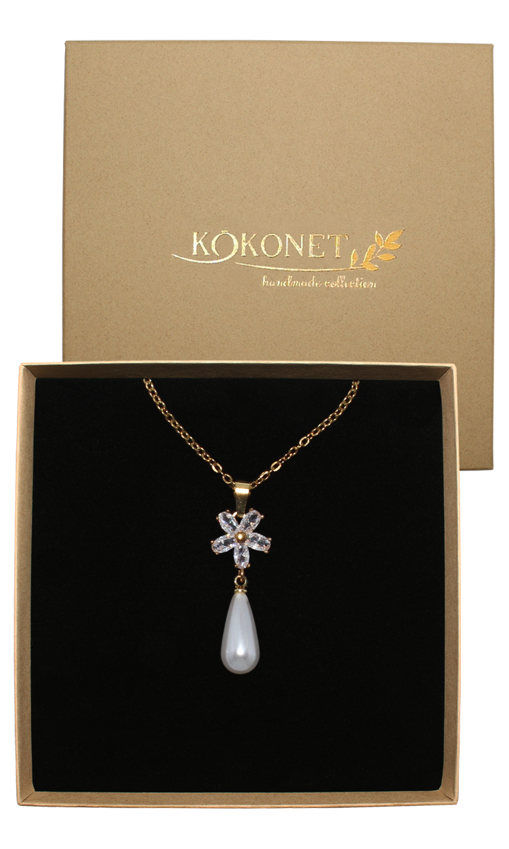 Złoty NASZYJNIK ślubny kwiaty perły ELEGANCKIE pudełko na prezent błysk